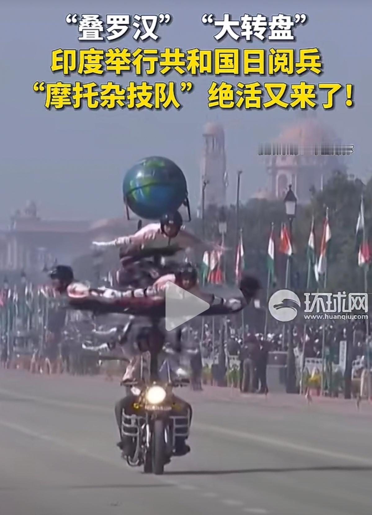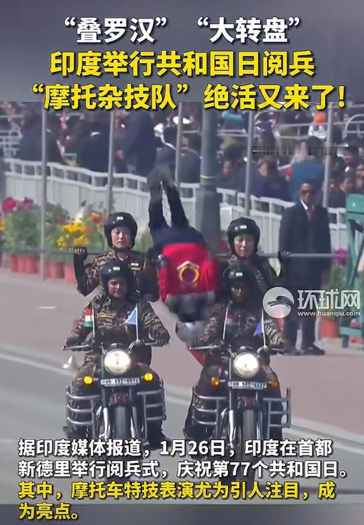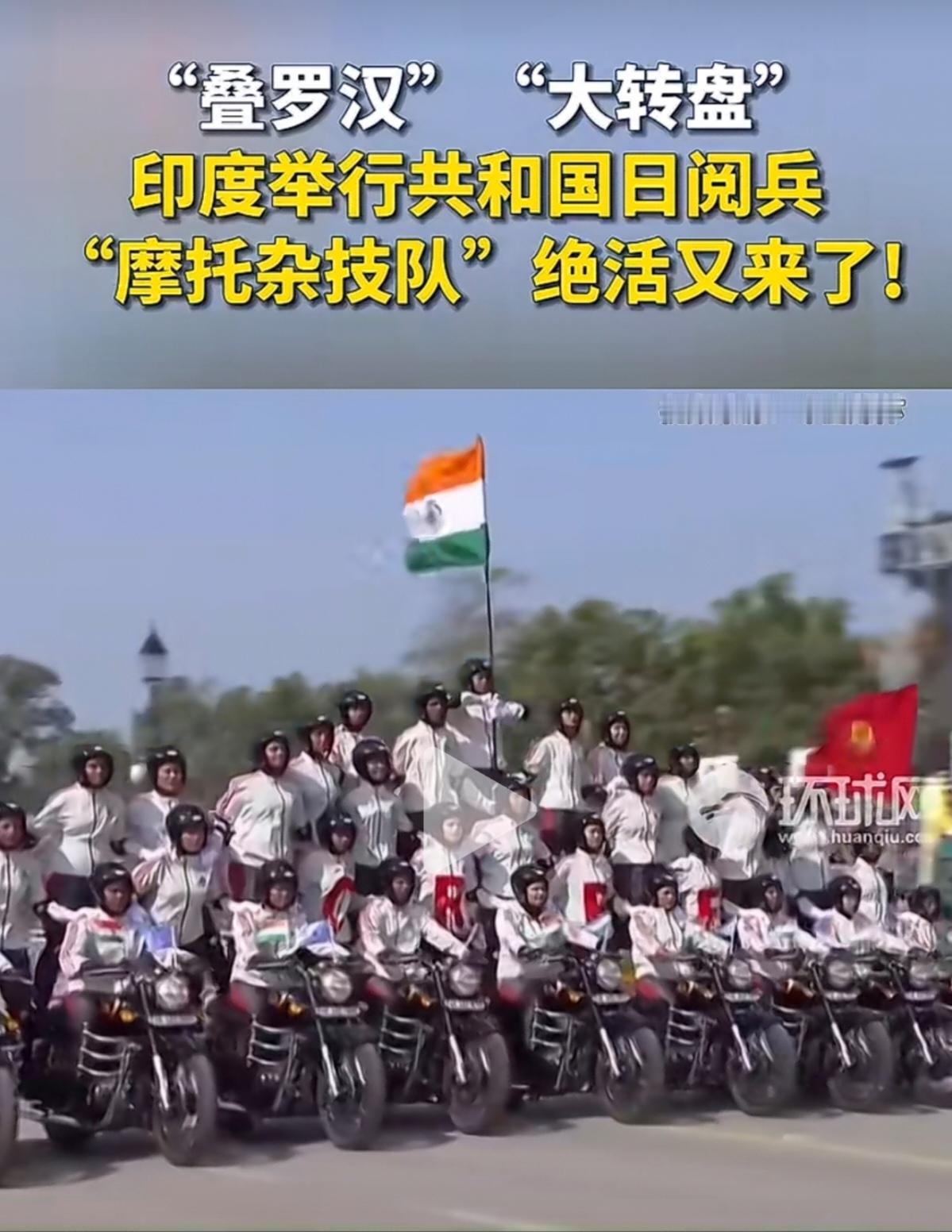 印度的共和国日阅兵,“摩托杂技队”又开始上绝活了。什么叠罗汉、屁股背对开摩托车、大转盘等等。真的是五花八门,层出不穷。 不得不佩服,印度摩托杂技队的杂技能力。这样的花样表演,估计在世界上也是独一份。可能在其他国家的阅兵式上,是很难看到的。 至于印度摩托车队的战斗力,行不行,就有待商榷了。毕竟杂技队,跟正规的摩托车队演练,还是有很大区别的。 但是,不得不说,在观赏性方面,确实挺赏心悦目的。个人认为,印度摩托杂技队,在杂技方面的能力,如果参加国际杂技比赛,或许可以取得不错的成绩。