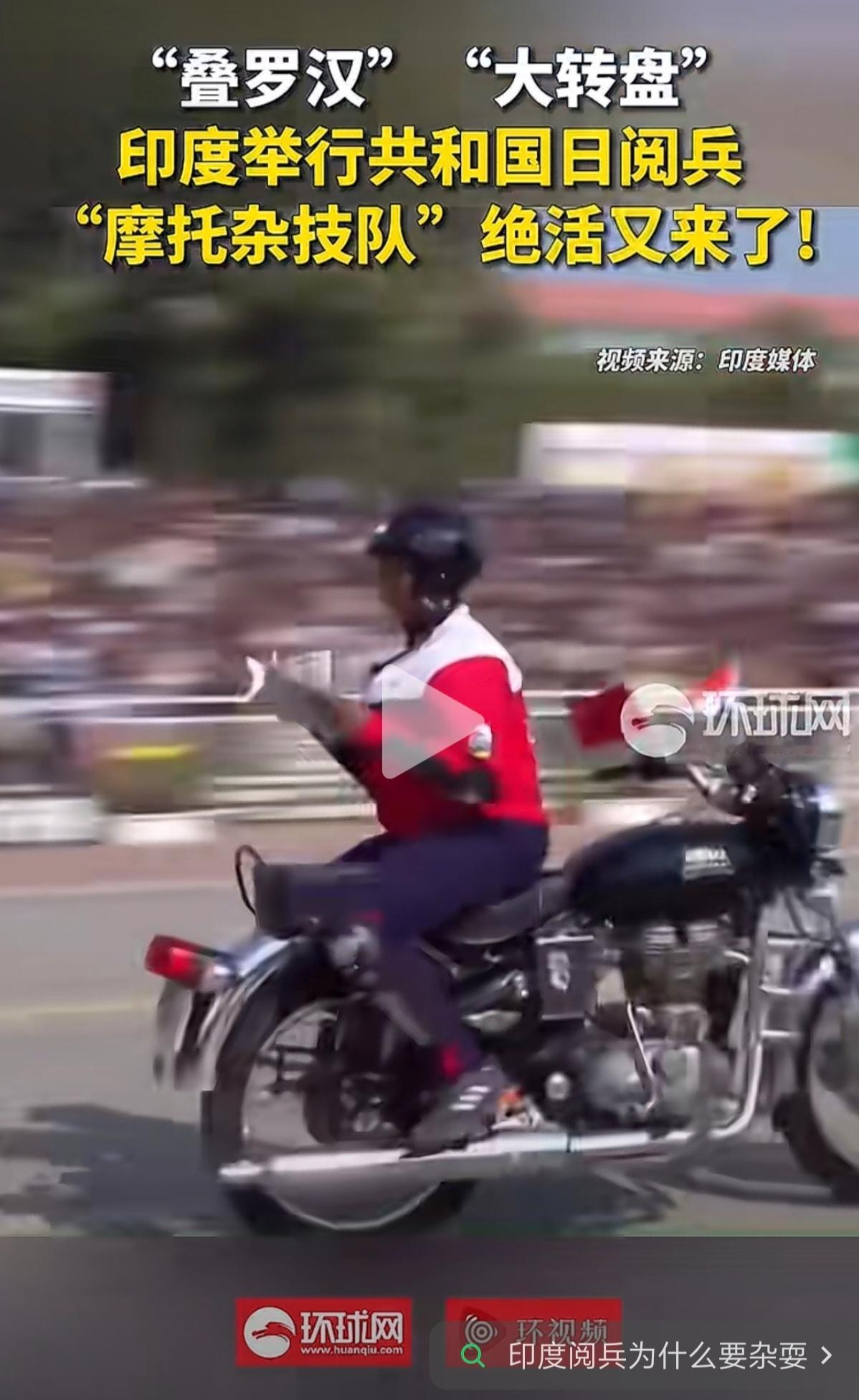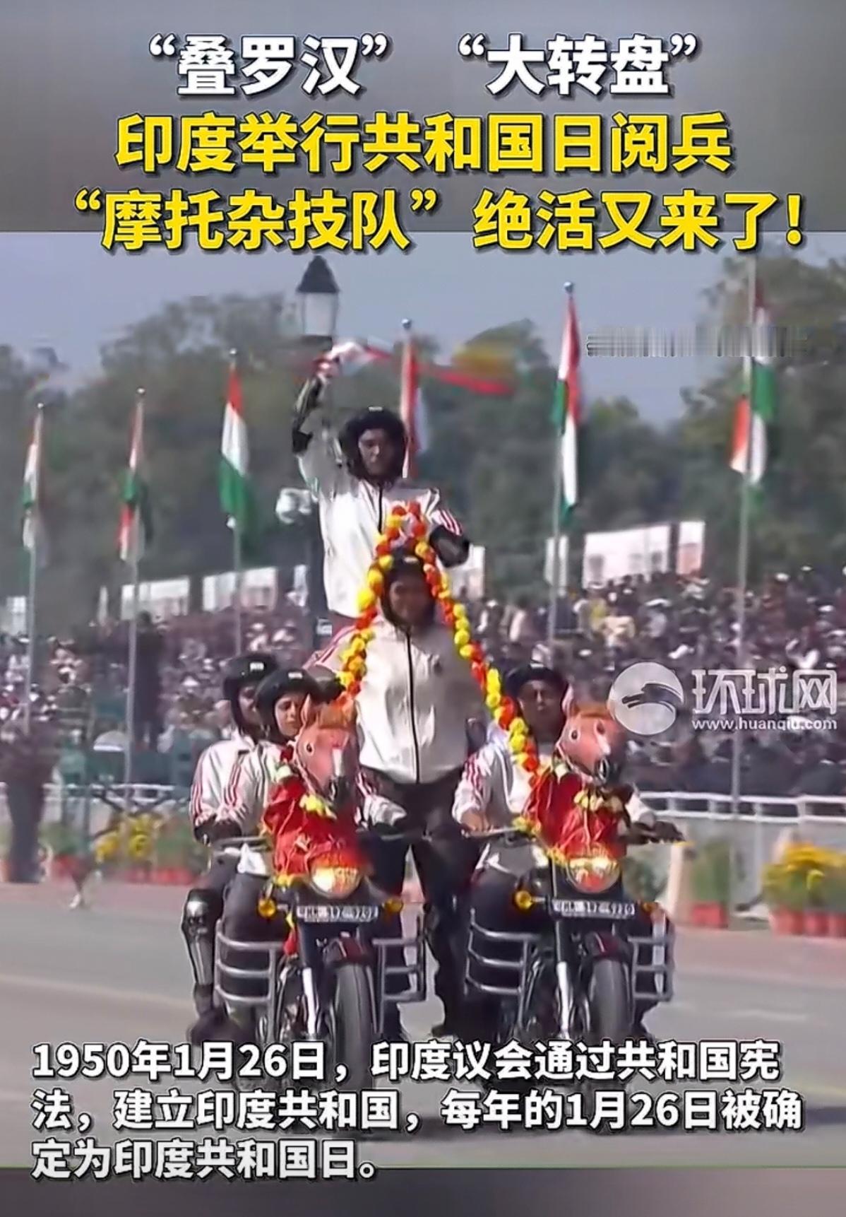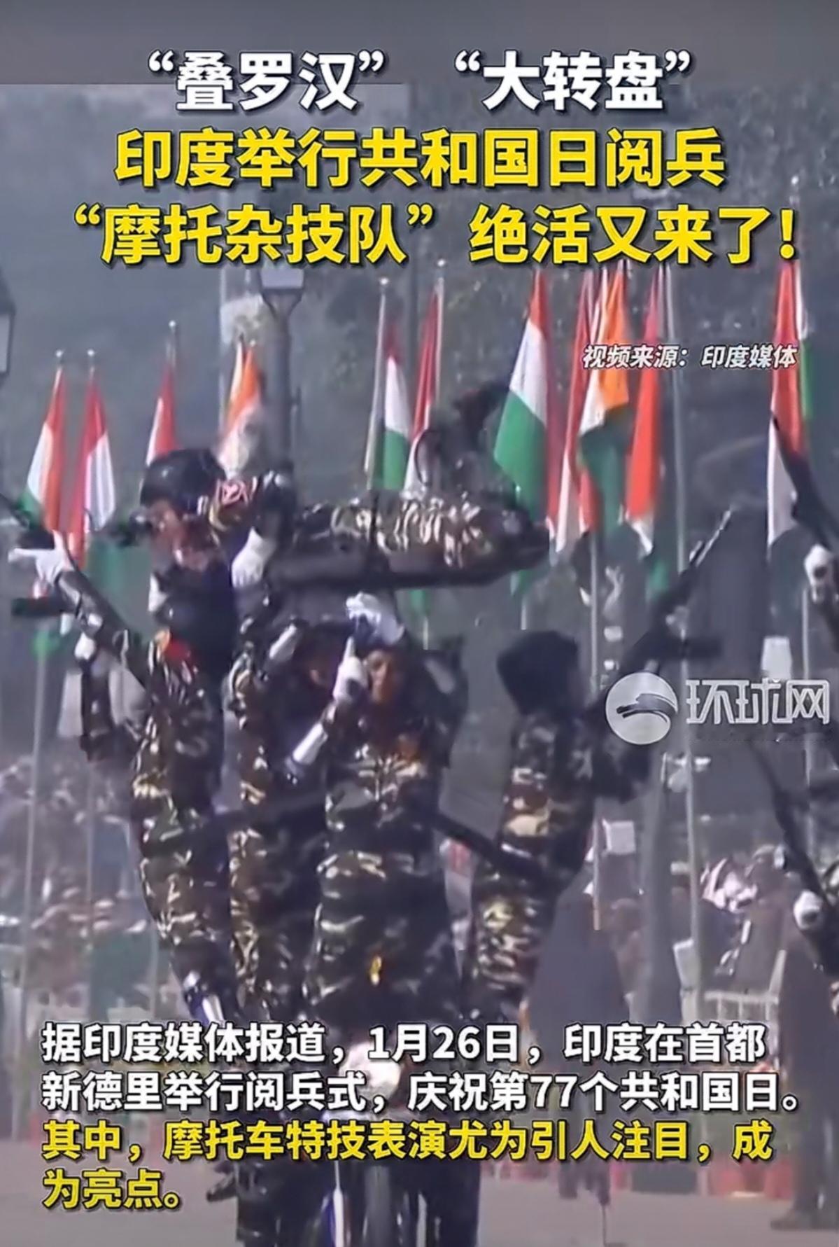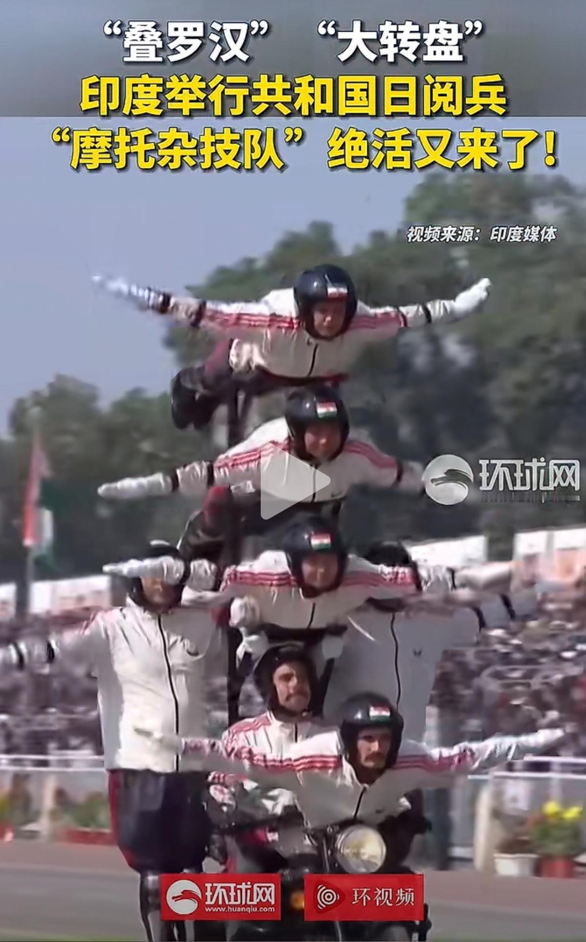 印度的共和国日阅兵,“摩托杂技队”又开始上绝活了。什么叠罗汉、屁股背对开摩托车、大转盘等等。真的是五花八门,层出不穷。 不得不佩服,印度摩托杂技队的杂技能力。这样的花样表演,估计在世界上也是独一份。可能在其他国家的阅兵式上,是很难看到的。 至于印度摩托车队的战斗力,行不行,就有待商榷了。毕竟杂技队,跟正规的摩托车队演练,还是有很大区别的。 但是,不得不说,在观赏性方面,确实挺赏心悦目的。个人认为,印度摩托杂技队,在杂技方面的能力,如果参加国际杂技比赛,或许可以取得不错的成绩。