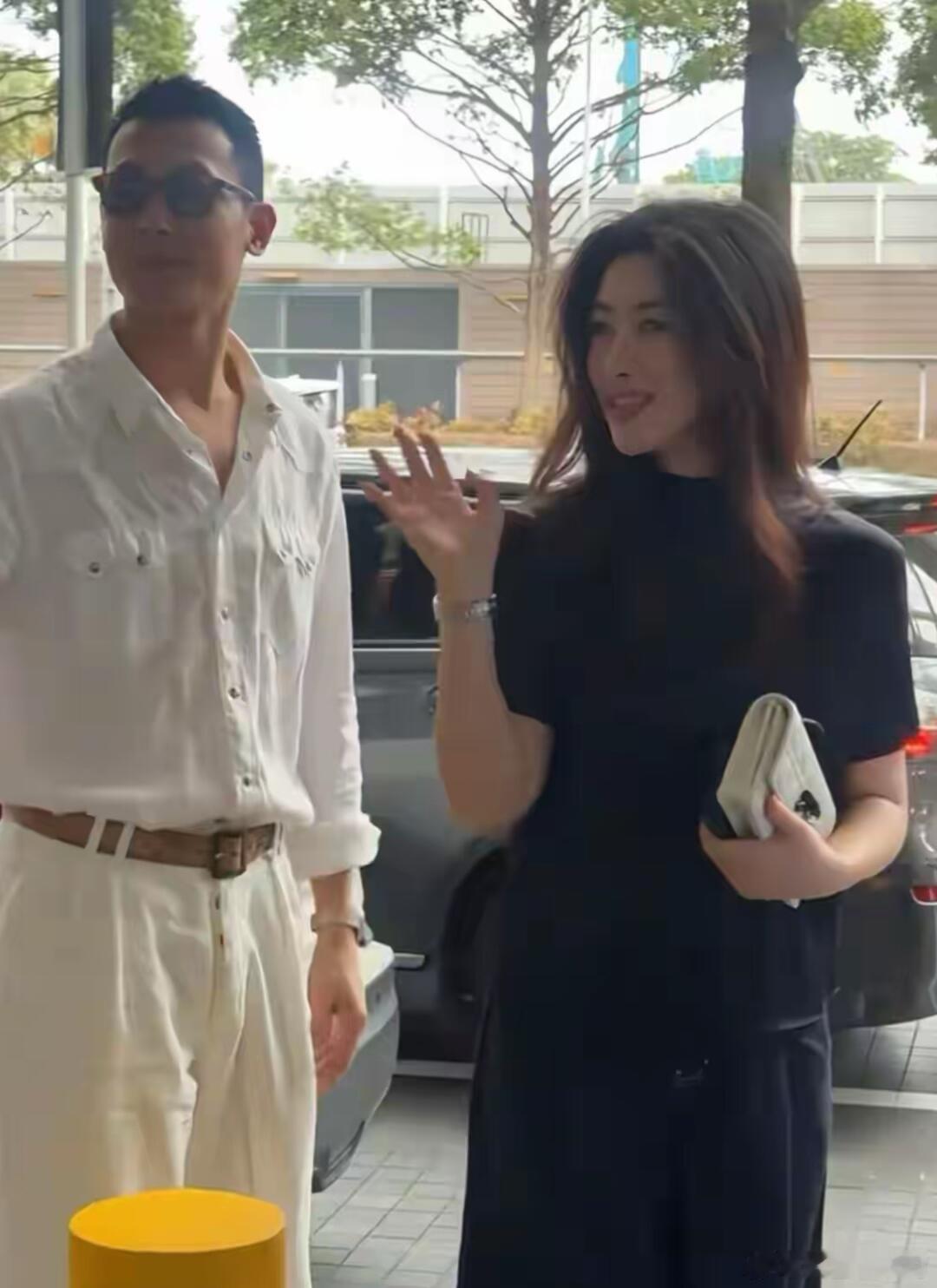 41岁朱珠和老公王昀佳在新加坡路边等车,夫妻俩看起来好时尚。