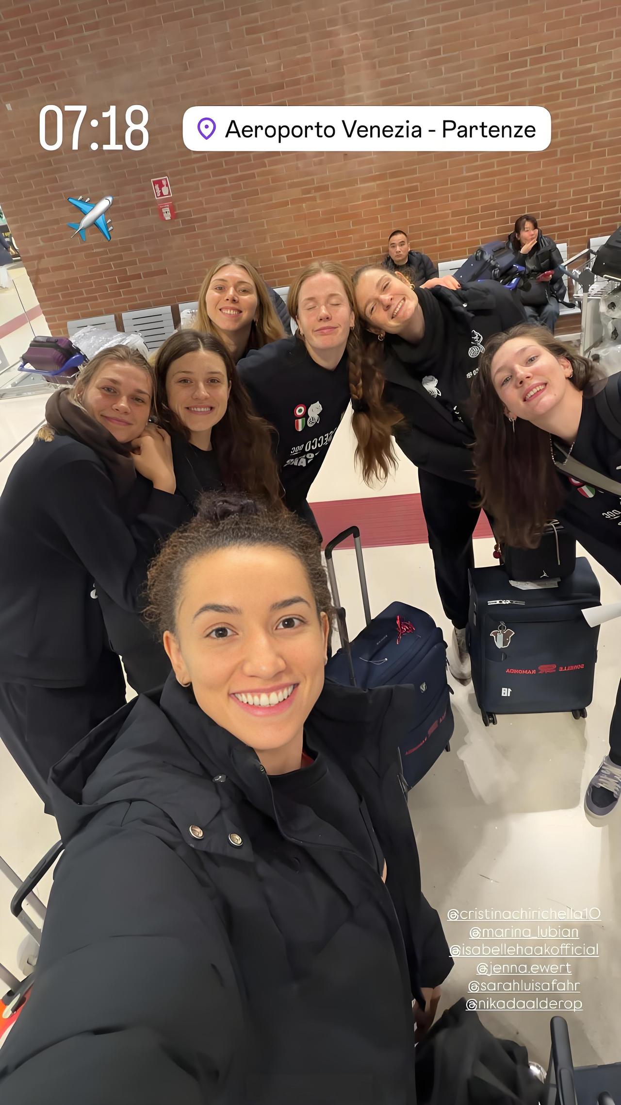 【1月27日欧冠科内利亚诺VS泽仁体育】 刚夺得意大利杯冠军的科内利亚诺女排 早晨六点多就启程奔赴土耳其 参加欧冠小组赛第五轮对阵泽仁体育 比赛时间:1月27日 23:00 观赛渠道:企鹅体育 新科意大利杯MVP加比同学 心情很美丽滴分享了4张出发图片 看看都谁出镜了?