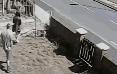 一男子跟在美女后面走出大门,女子青春亮丽的背影激起了他的表现欲,在女子跨越大门的瞬间,他决定来一个优美的跨墙超越来展示他无与伦比的技能与体魄。 只见他轻展猿臂双脚点地,来到围墙前一个纵跃,他估错了路线,右脚踢到了墙上,一个倒栽葱扑到在墙外,美女刚好走出大门,目睹了他“狗吃屎”的全过程,惊悚地缩着脖子捂住了嘴巴。 本来想赶在美女前面秀一把,结果,糗了一把。
