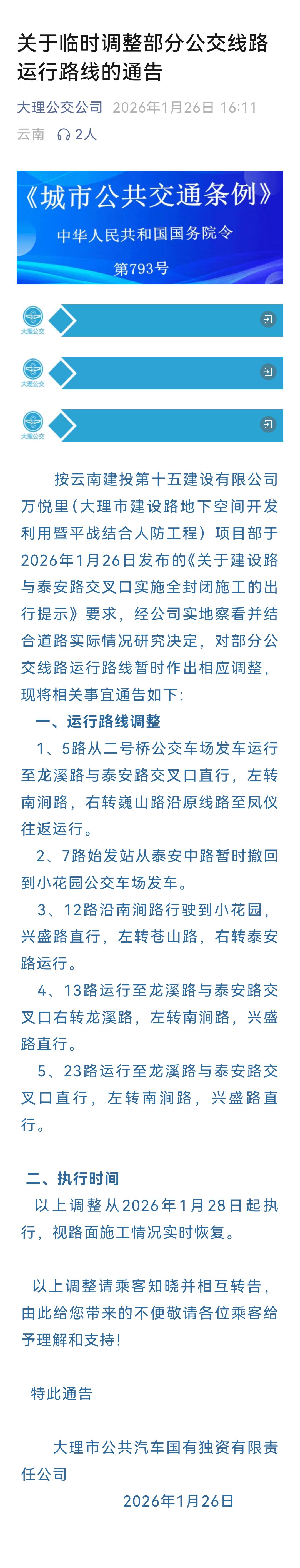 大理公交路线大调整。 大理公交路线要大调整,出行前一定要看,别坐错车了。因云南建投第十五建设有限公司万悦里项目施工,大理市建设路与泰安路交叉口将全封闭施工。为应对此情况,大理公交公司决定对部分线路进行临时调整。 ·五路公交从二号桥发车到龙溪路与泰安路交叉口后直行,再经南涧路、巍山路至凤仪往返。 ·七路公交始发站暂时撤回到小花园公交车场。 ·十二路公交则沿南涧路到小花园,再经兴盛路、苍山路、泰安路运行。 ·十三路和二十三路公交在运行至龙溪路与泰安路交叉口后都有相应的路线调整。 这些调整都是为了应对施工带来的交通变化,确保公交运行顺畅。大家出行前一定要提前规划好路线。 对此你有什么看法?快来评论区留言分享。
