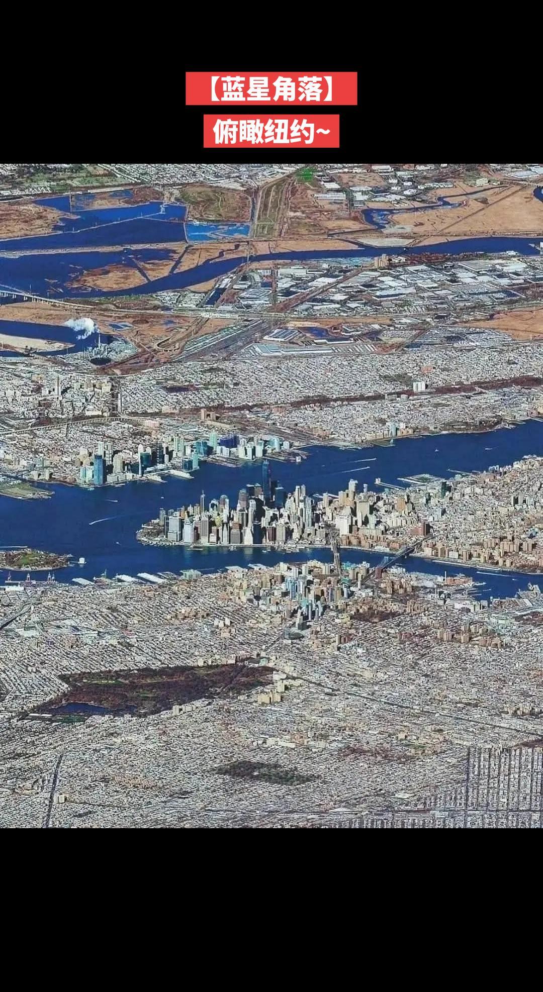这是一幅最为复杂且令人印象深刻的纽约市及其周边区域的航拍景观图,重点展示了曼哈顿下城、哈德逊河与东河,以及背景中新泽西州的部分区域。 · 中心区域:曼哈顿岛,其南端(下城及金融区)耸立着密集的摩天大楼群。世贸中心一号楼清晰可见。 · 河流上方:新泽西州的泽西市及工业区,可见铁路设施、高速公路及湿地景观。 · 河流下方:布鲁克林和皇后区,呈现出高度城市化的密集建筑群与网格状街道布局。 · 左下角:深绿色的矩形地块是位于布鲁克林的展望公园。 · 河流之间:布鲁克林大桥和曼哈顿大桥将曼哈顿与布鲁克林连接起来。