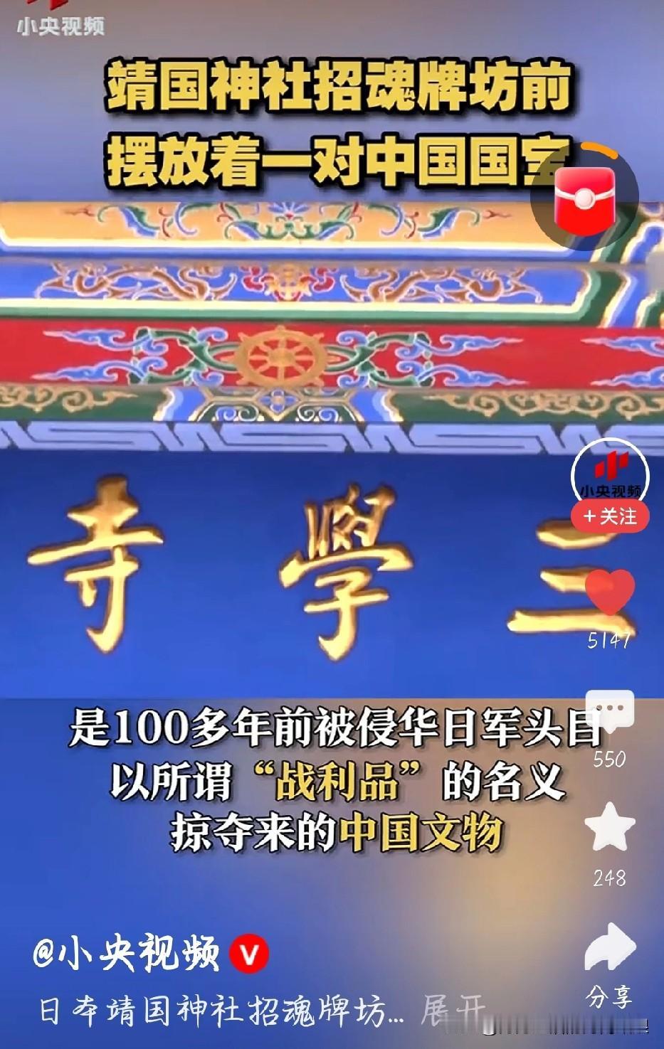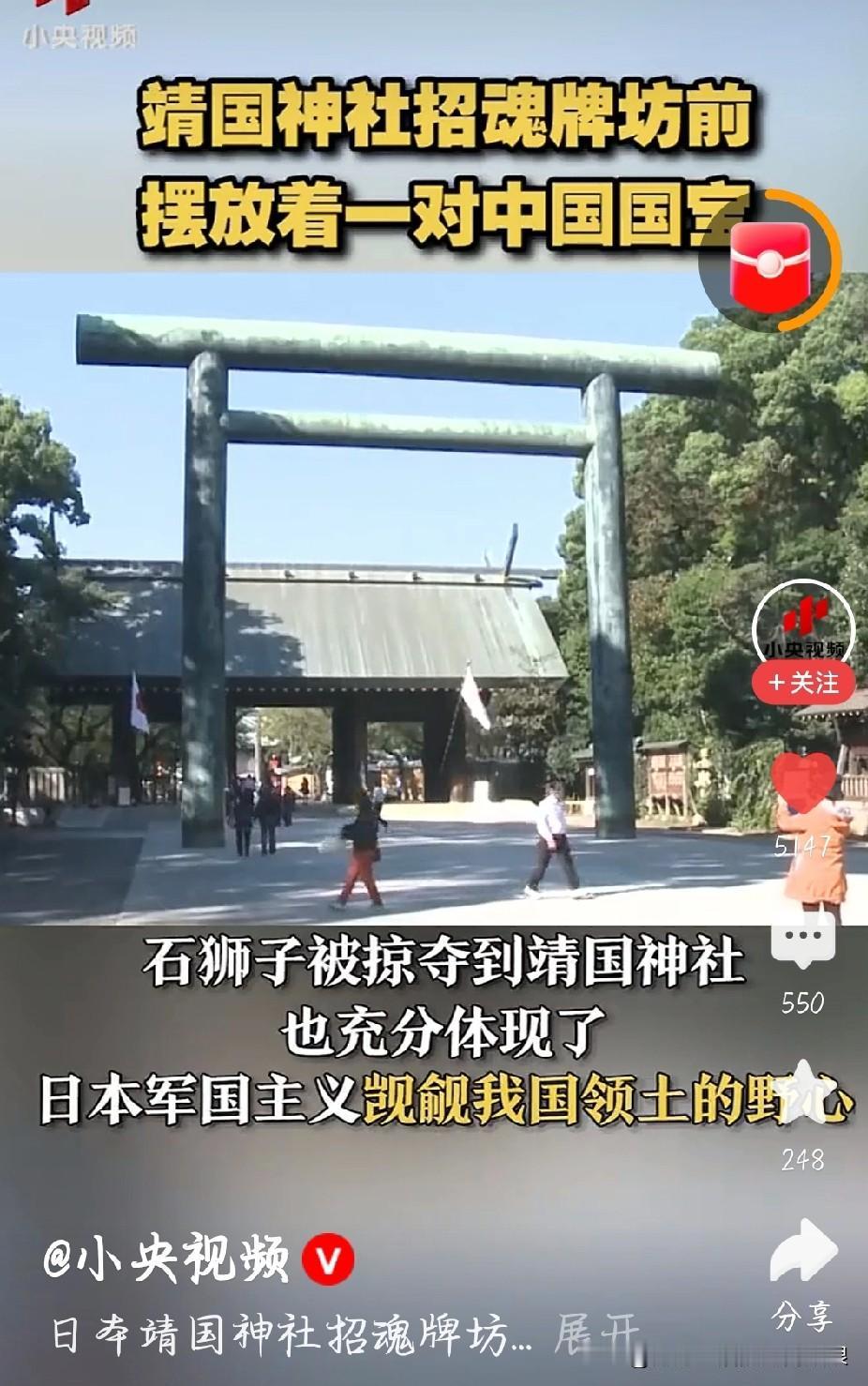 真的越看越气!靖国神社门口那对石狮子,根本不是日本的,是当年他们从中国抢来的!我们的东西,却被摆在那种供奉战犯的地方撑门面,怎么看怎么恶心。抢了别人的宝贝,还当自己的荣光,这不是无耻是什么?这些文物本来就该回中国,这是明明白白的文化掠夺。日本不仅欠我们一个解释,更欠我们一个道歉。历史不会因为时间就被洗白,这笔账,我们永远记得!! 靖国神社前的石狮掠自中国, 靖国神社石狮来自中国 文物必须回家 勿忘国耻, 图片截图于小央视频
