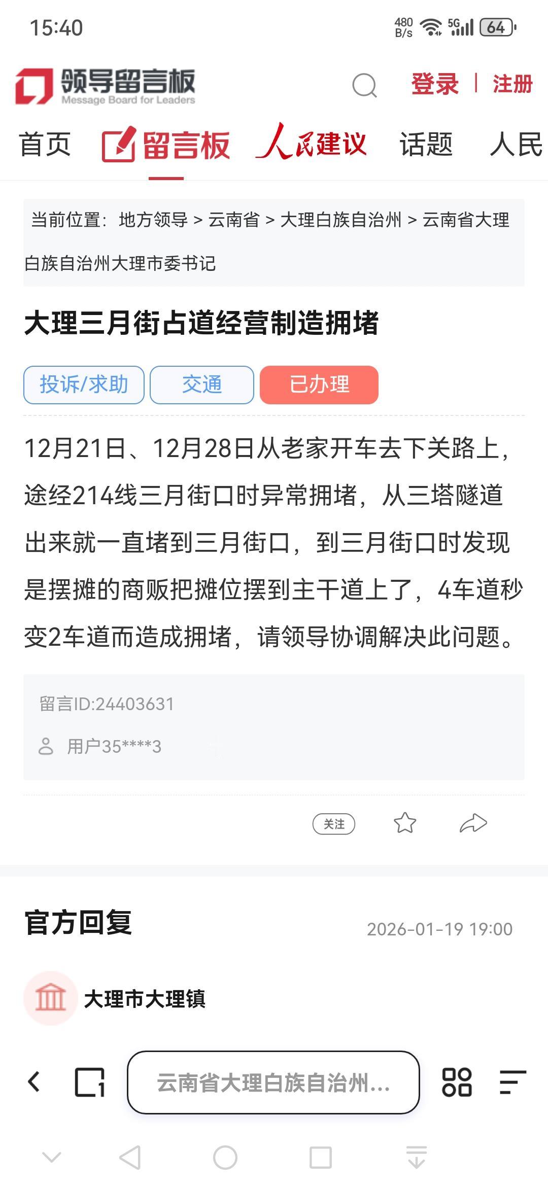 大理三月街摊贩占道,四车道瞬间变为两车道。 近日,大理网民于人民网领导留言板反映,途经214线三月街口时遇到严重拥堵状况。经核实,因民俗和旅游业发展,三月街每月农历初二、初九等日为赶集日,流动摊贩聚集占道,致使交通混乱。 自2026年1月4日起,执法队对占道摊贩开展劝导教育工作,对屡教不改者暂扣摊车,有效缓解了拥堵难题。官方回应着重指出,整治后占道乱象已得到控制。大理镇表示会持续强化巡查力度,探索集市管理新途径,保障交通和市场秩序,未来还将进一步完善管理举措。 占道现象