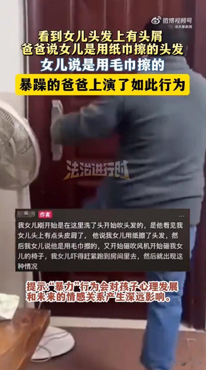 广东一位爸爸因为女儿头发上的头屑,跟孩子起了争执还当场暴力打砸的事,看了真的让人心里堵得慌,一点小事闹到这个地步,最受伤的还是孩子。这位爸爸看到女儿头发上有头屑,一口认定孩子是用纸巾擦的头发,觉得孩子这样做不对,可孩子明明解释自己是用毛巾擦的,只是没擦干净才有头屑,换谁听了孩子的解释,好好说两句也就算了,可这位爸爸根本没听进去,脾气一下子就上来了,当场就发起了火。怒火上头的爸爸,随手就把吹风机砸了,好好的吹风机瞬间就被砸坏,紧接着又把旁边的椅子也狠狠砸向地面,哐哐的砸东西声,配上爸爸暴躁的神情,整个家里的气氛瞬间降到了冰点,孩子被爸爸这突如其来的暴怒和打砸行为吓得不轻,根本不敢再辩解一句,只是慌慌张张地赶紧跑到自己的房间里躲起来,估计孩子在房间里都还吓得瑟瑟发抖,满心的委屈和害怕却不敢说。其实说到底,这就是一件再小不过的小事,头发上有头屑,哪怕真的是用纸巾擦的,好好跟孩子说下次用毛巾擦干净就好,孩子肯定也能听进去,可这位爸爸却用最极端的方式处理,不仅动手打砸家里的东西,还把负面情绪全都发泄了出来,完全没考虑到孩子的感受。孩子在面对家长的暴怒时,首先感受到的是恐惧,这种恐惧不会随着事情过去就消失,反而会在心里留下深深的印记。教育孩子的核心从来都不是发脾气、靠威慑,而是好好沟通、耐心引导,孩子犯点小错、有小毛病都是很正常的事,多点耐心听孩子说话,多点包容教孩子改正,远比摔东西、发脾气有用得多。家长是孩子的第一任老师,家长的一言一行都会被孩子看在眼里、记在心里,用平和的态度对待孩子,才能养出内心温暖、性格开朗的孩子,而不是用暴力,把孩子推到恐惧的对立面。爸爸怀疑女儿用纸巾擦头发暴力打砸 来源:法治进行时