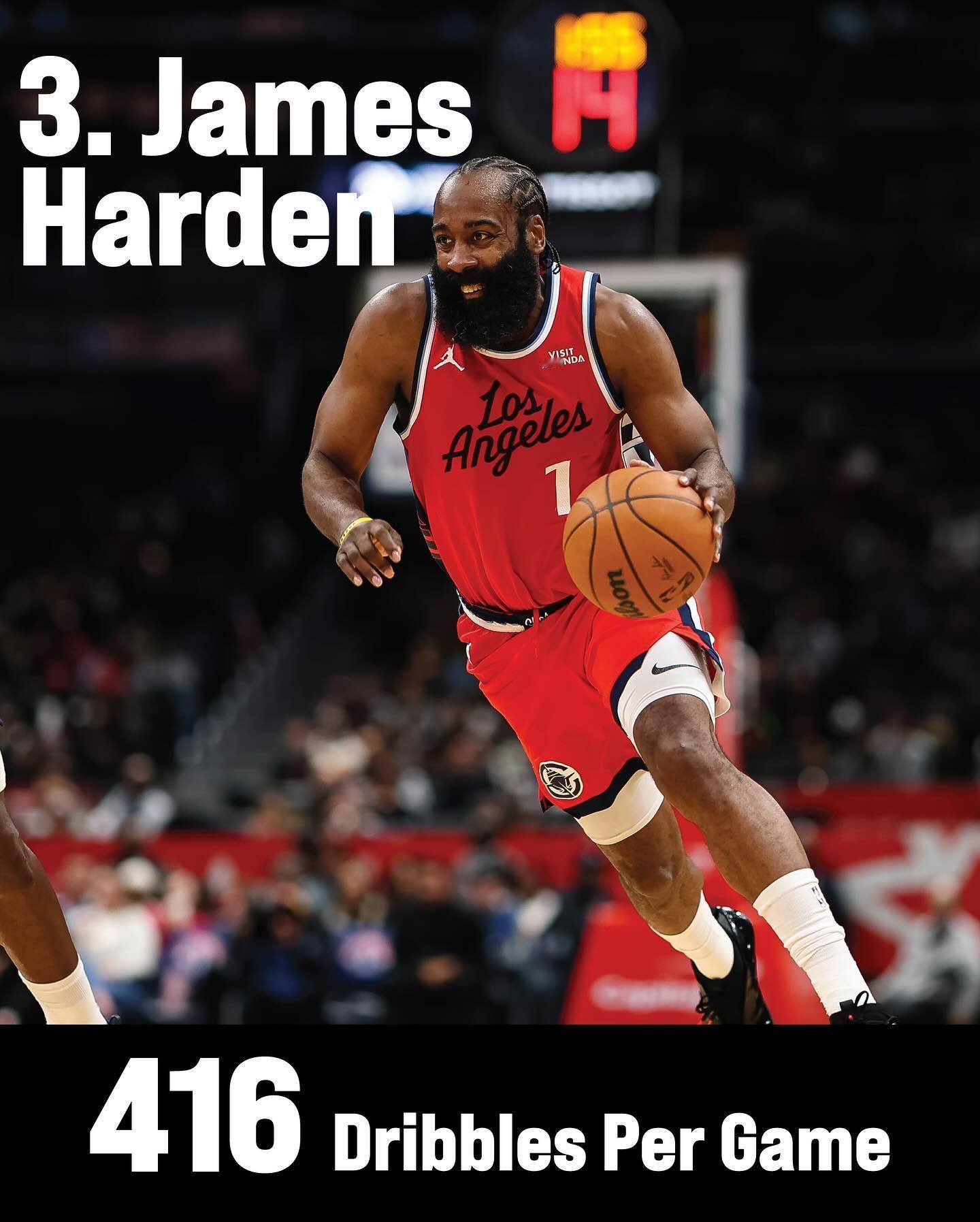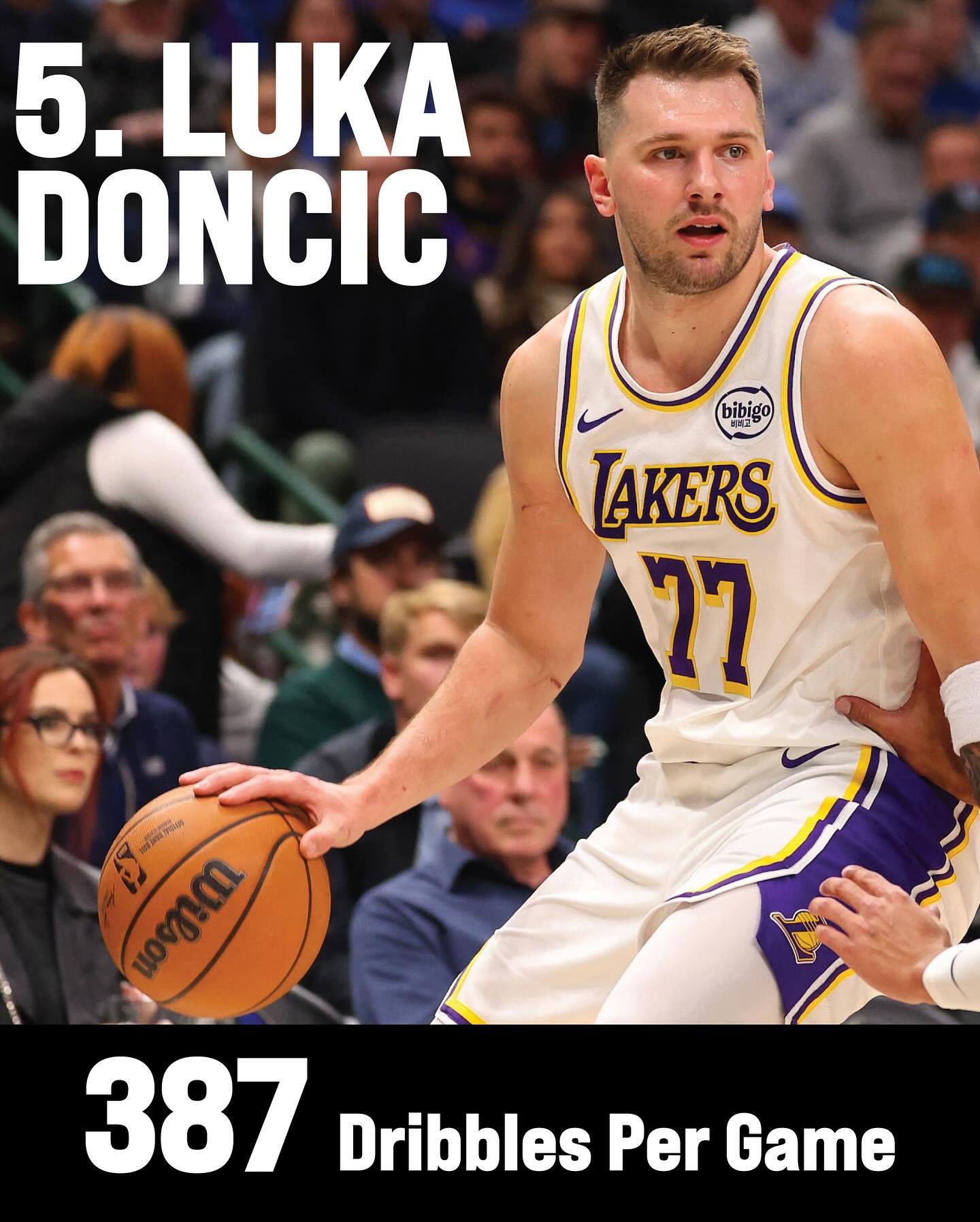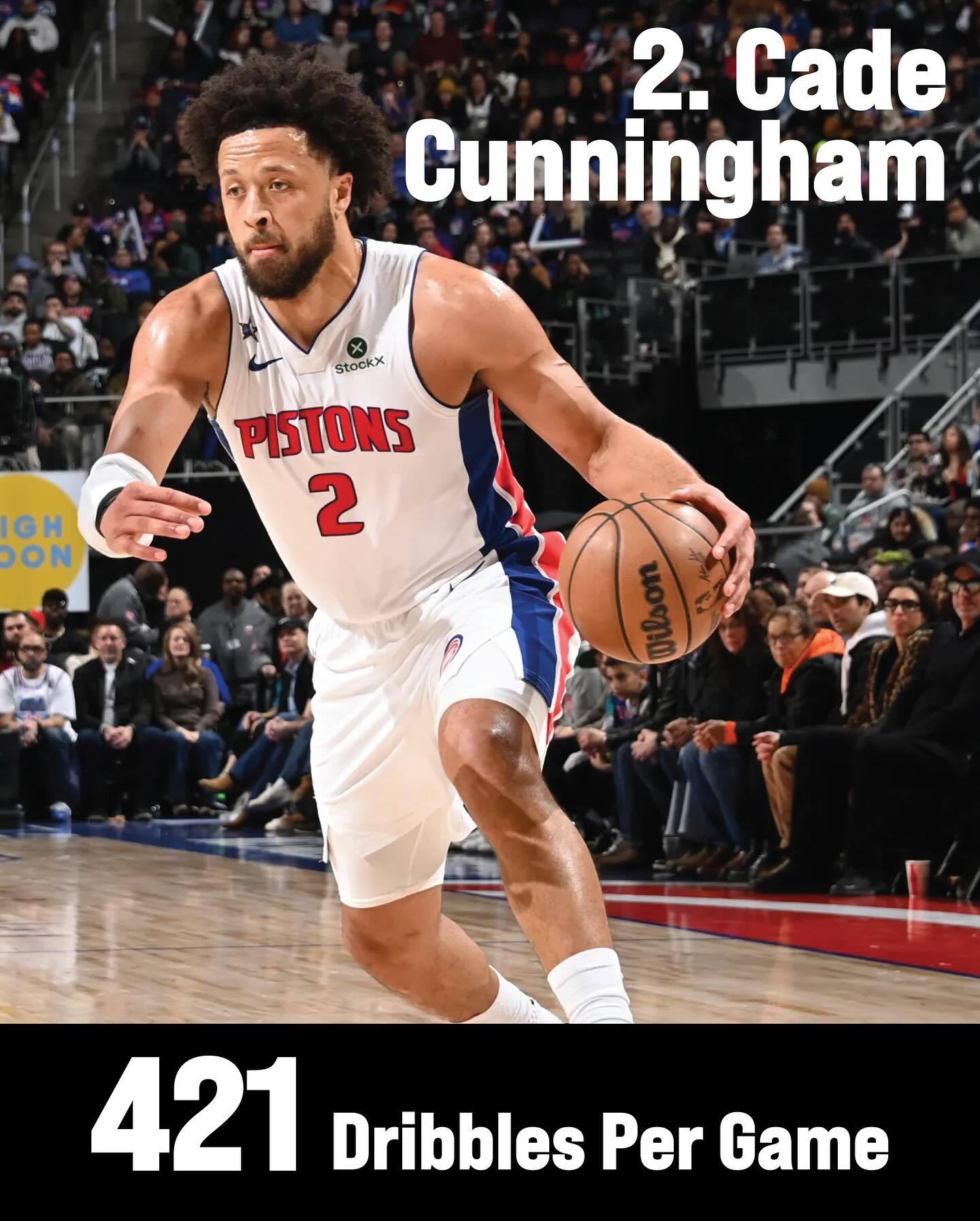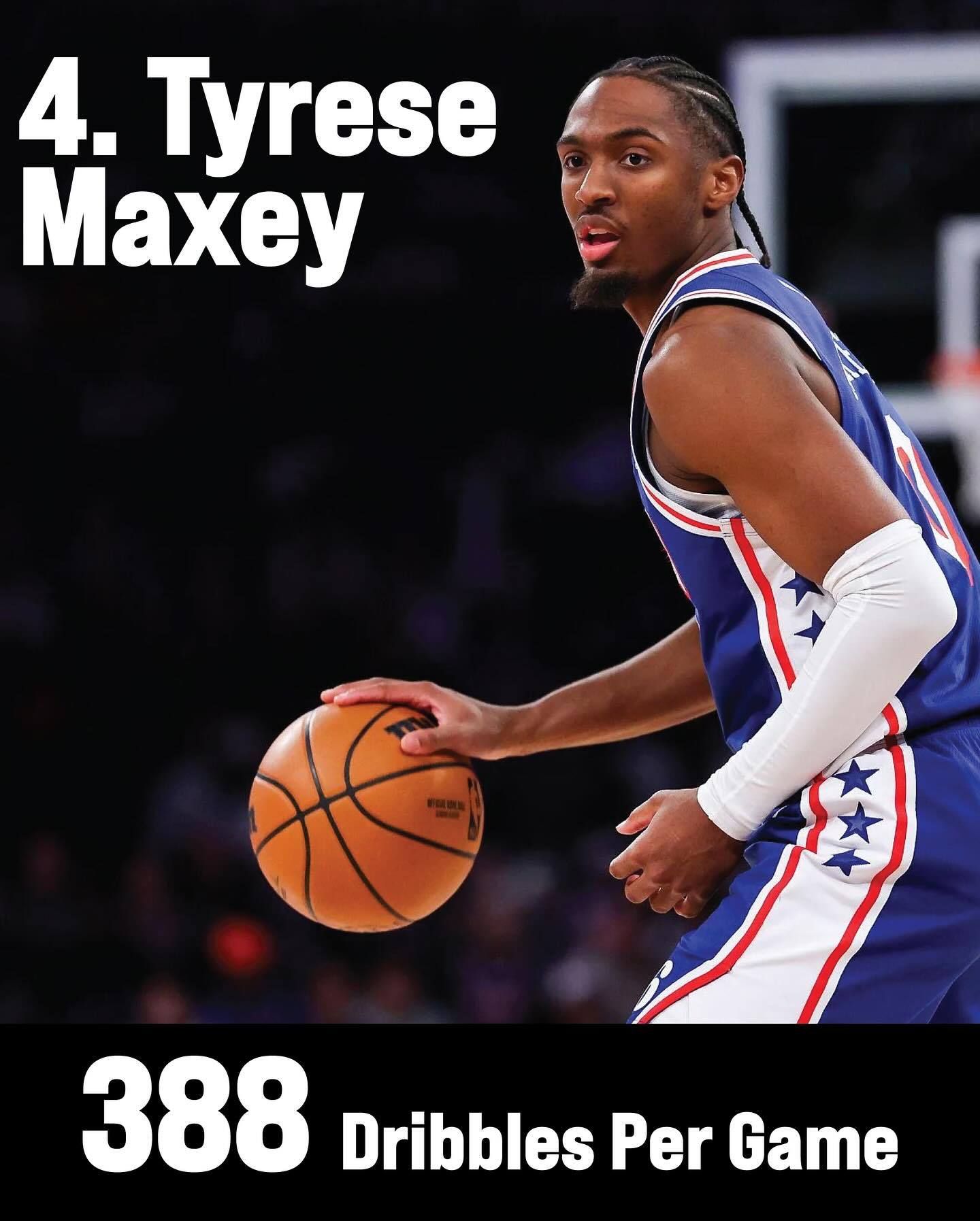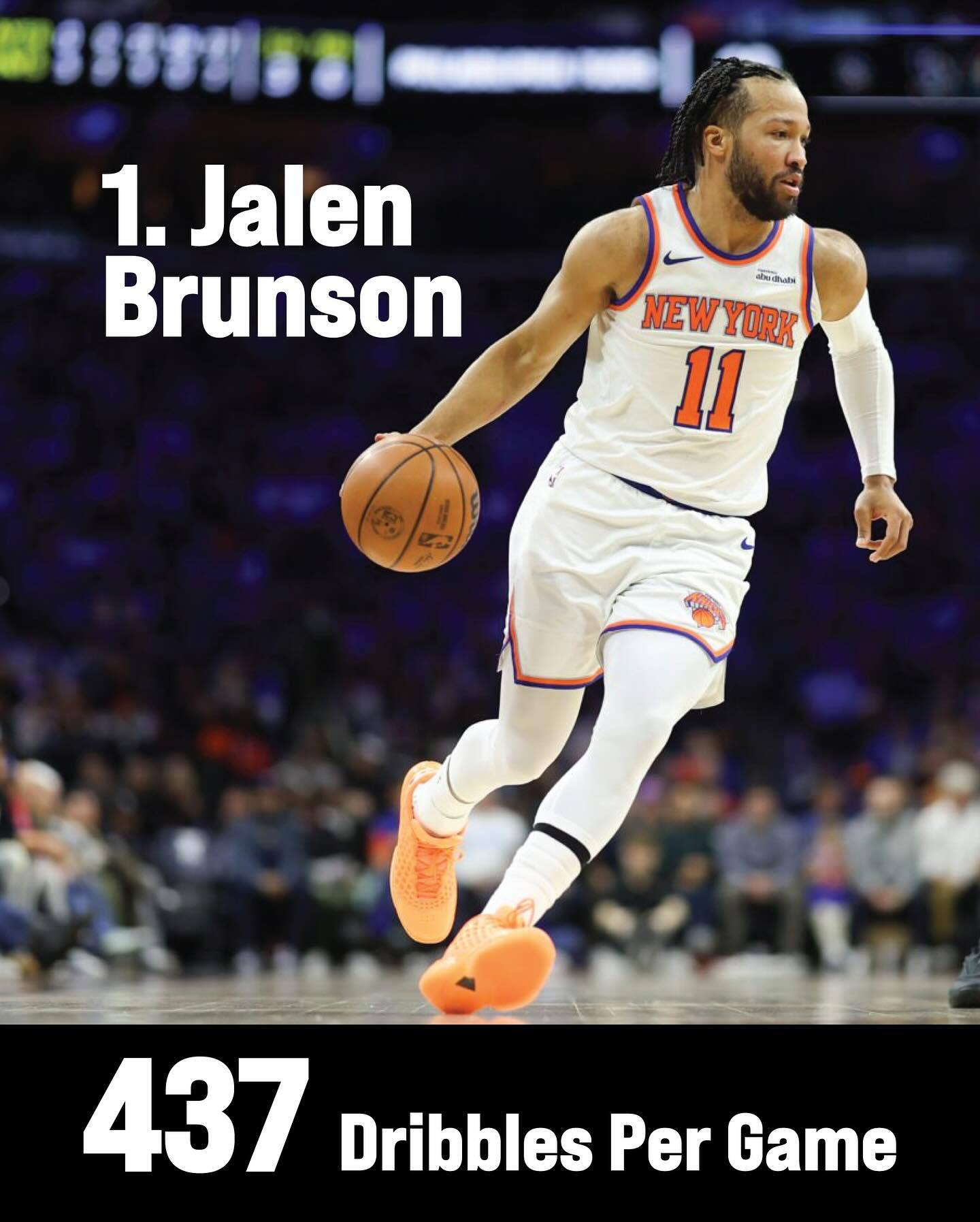 一个有意思的统计,场均拍球次数最多的五位球员:布伦森、坎宁安、哈登、马克西、东契奇。布伦森一场比赛要拍437次球。