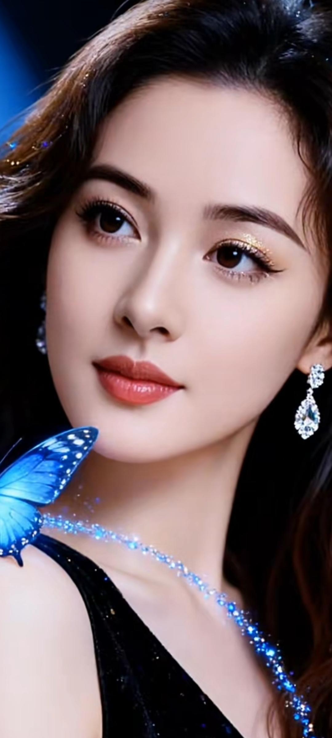梦幻蓝蝶轻触香肩,闪耀珠宝映衬优雅气质。