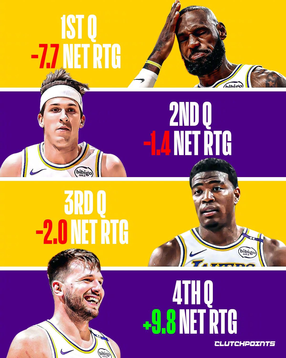 湖人的第四节确实强!他们前三节净效率都是负值,其中第一节-7.7,而到了第四节他们净效率直接干到联盟第一的+9.8!