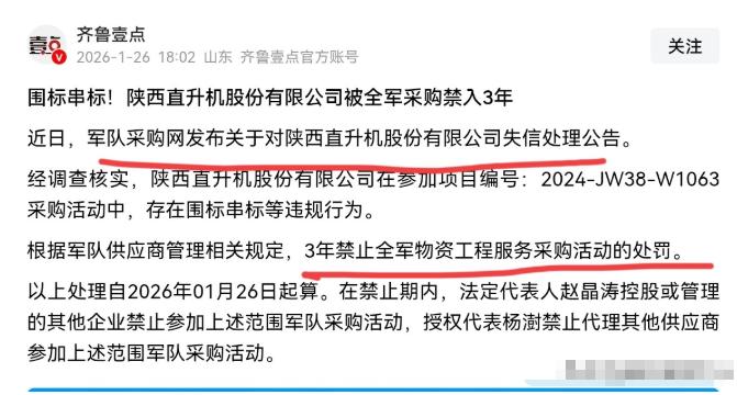 胆大包天!我们国家军队内部反腐打贪力度这么大,竟然还有人顶风作案,在军用装备采购方面搞围标串标! 1月26日,根据国内媒体报道,近日,军队采购网发布关于对陕西直升机股份有限公司失信处理公告。该公告显示,该公司在涉及军方的采购活动中,存在围标串标等违规行为。 我们有关部门根据军队供应商管理相关规定,对该司作出处罚,禁止其3年内不得参与全军任何物资工程服务的采购活动。我们国家涉及军队的反腐打贪力度如此巨大,没想到现在还有人顶风作案。 这“围标串标”说起来也不算啥新鲜手段了,简单讲就是几家本来应该是竞争关系的公司,私下里串通好,一起演场戏给招标方看。 比如,事先定好由谁中标,其他几家陪着走个过场当“陪跑”,报价时互相商量着来,避免真竞争。有时候为了更逼真,甚至会用同一台电脑、同一个加密锁来制作好几家公司的投标文件,或者在电子文件属性里留下相同的作者信息。 您可能会问,这帮人为啥要冒这么大风险干这种事呢?说到底,绕不开一个“利”字。军队采购涉及的资金规模巨大,一年下来有2000到3000亿元。这么大一块“肥肉”,自然会让一些利欲熏心的人打起歪主意。 通过围标串标,他们可以轻松操控价格,比如一家通信工程领域的央企,在火箭军的战略通信工程中,就通过组织三家关联公司围标,最后以高于市场价23%的报价中标,短短九年时间虚增的成本就超过了8个亿。 这8个亿可是真金白银,原本可以用来提升装备质量、改善部队条件的,就这么白白流进了个人的口袋。而且,对于一些经营状况本来就不太好的公司来说,军队订单更是救命稻草。 当然,咱们也得看到,军队对这些蛀虫的打压力度是空前强大,就在去年年底,火箭军倒查九年内的采购项目,一直查到2016年,连续发布180条公告,一口气处罚了74位评标专家和116家供应商。 这份决心和力度,就是要告诉所有人:别以为时间久了就能蒙混过关,旧账一样翻出来算!特别是对于那些胆大包天,甚至充当“采购掮客”的评标专家,处罚更是严厉,直接终身禁入,连带着他们控股或管理的企业一起受罚。 中央军委装备发展部也出台了规定,要求评审专家对个人的评审意见终身负责,要是发现谁搞倾向性评分或者串通评分,直接终身禁赛。这就好比给专家们戴上了“紧箍咒”,时刻提醒他们要公正公平。 所以说,虽然陕西直升机股份有限公司这次事件再次敲响了警钟,说明反腐之路仍需努力,但咱们更该看到军队系统“零容忍”的态度和“除恶务尽”的决心。 那些还想靠着老一套“潜规则”在军队采购里捞油水的人,真得好好掂量掂量了。这可不是开玩笑的,搞不好就是“拔出萝卜带出泥”,把自己彻底交代进去。正如解放军报所强调的,军队采购关系到国家安全和国防建设,容不得半点沙子。 唯有持续保持高压态势,不断扎紧制度的笼子,才能确保国家的每一分军费都花在刀刃上,真正打造出清正廉洁、不可战胜的钢铁长城。