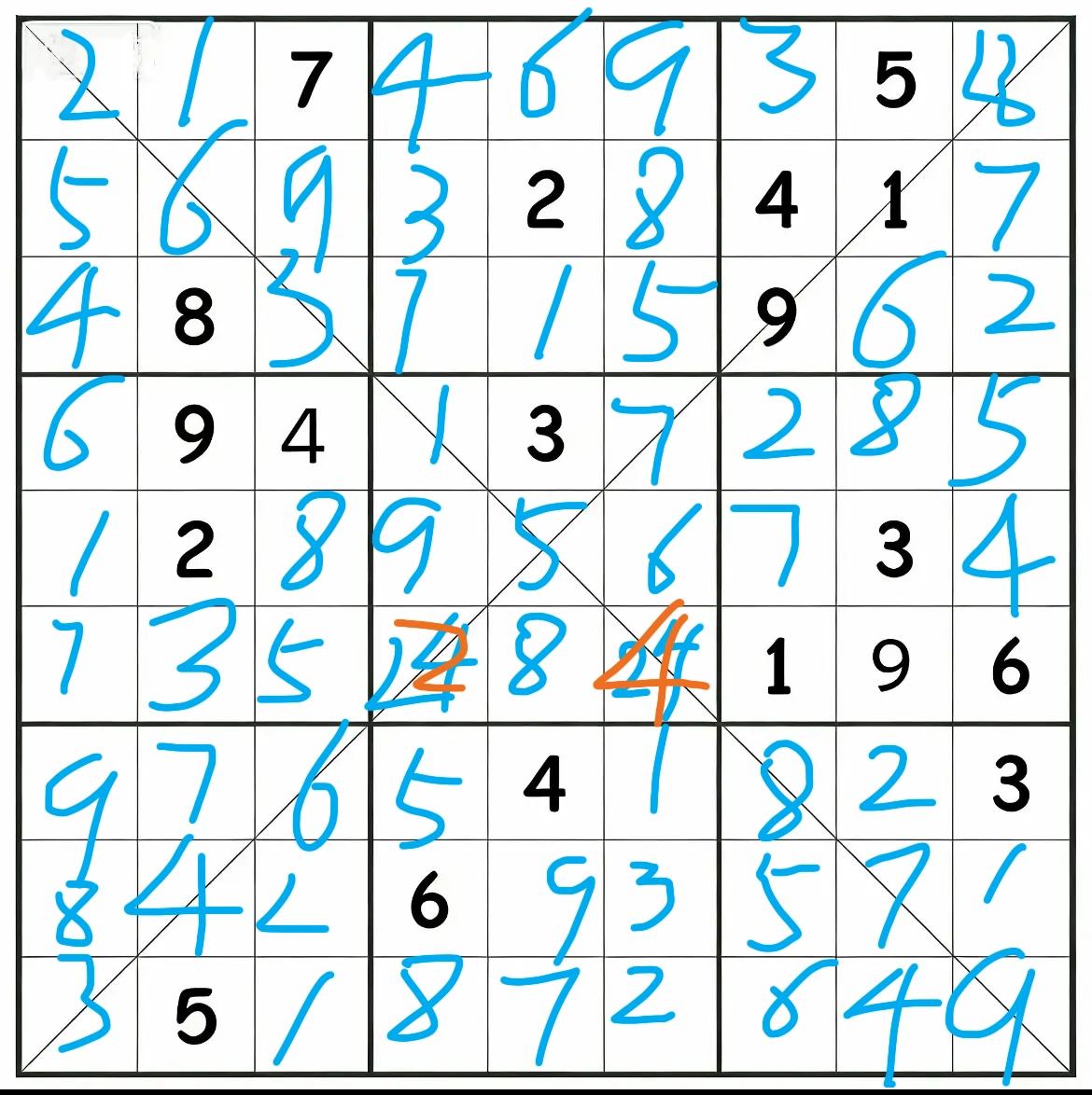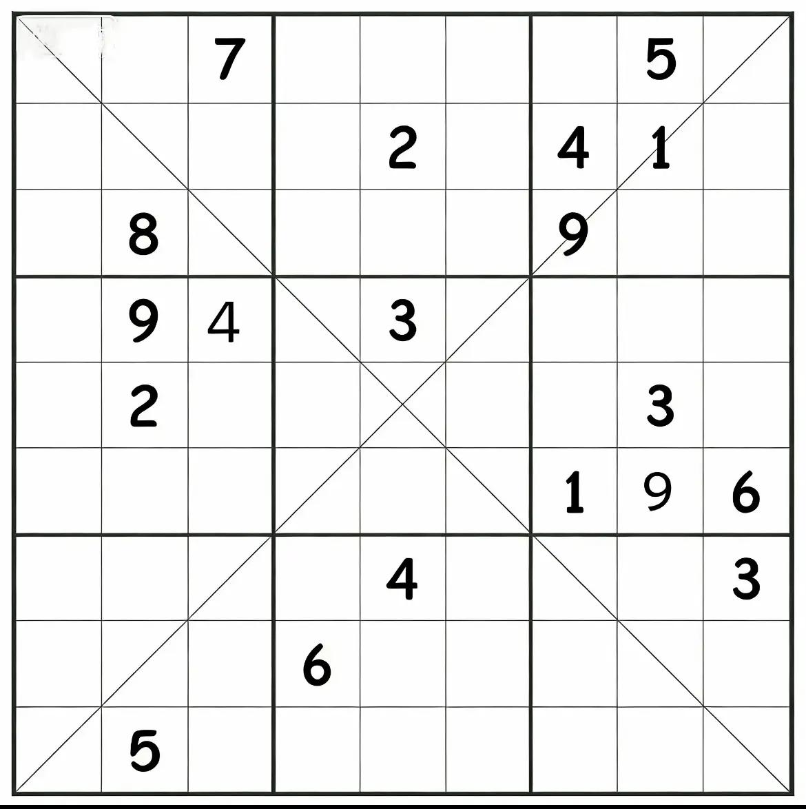这个对角线数独比较烧脑,最近一段时间喜欢上了数独这种益智小游戏,对常规数独基本上掌握了解题技巧,后来页做一些对角线数独, 对角线数独顾名思义就是在满足常规数独规则的条件下,再加上一个约束条件,就是两条对角线上1-9只能出现一次,也不能重复, 本来约束条件越多,解题难度越小,事实也是如此,但这道对角线数独比较烧脑,我用了两天时间才解出来,因为加了两个约束条件,越解越乱,友友们不妨你们试一试