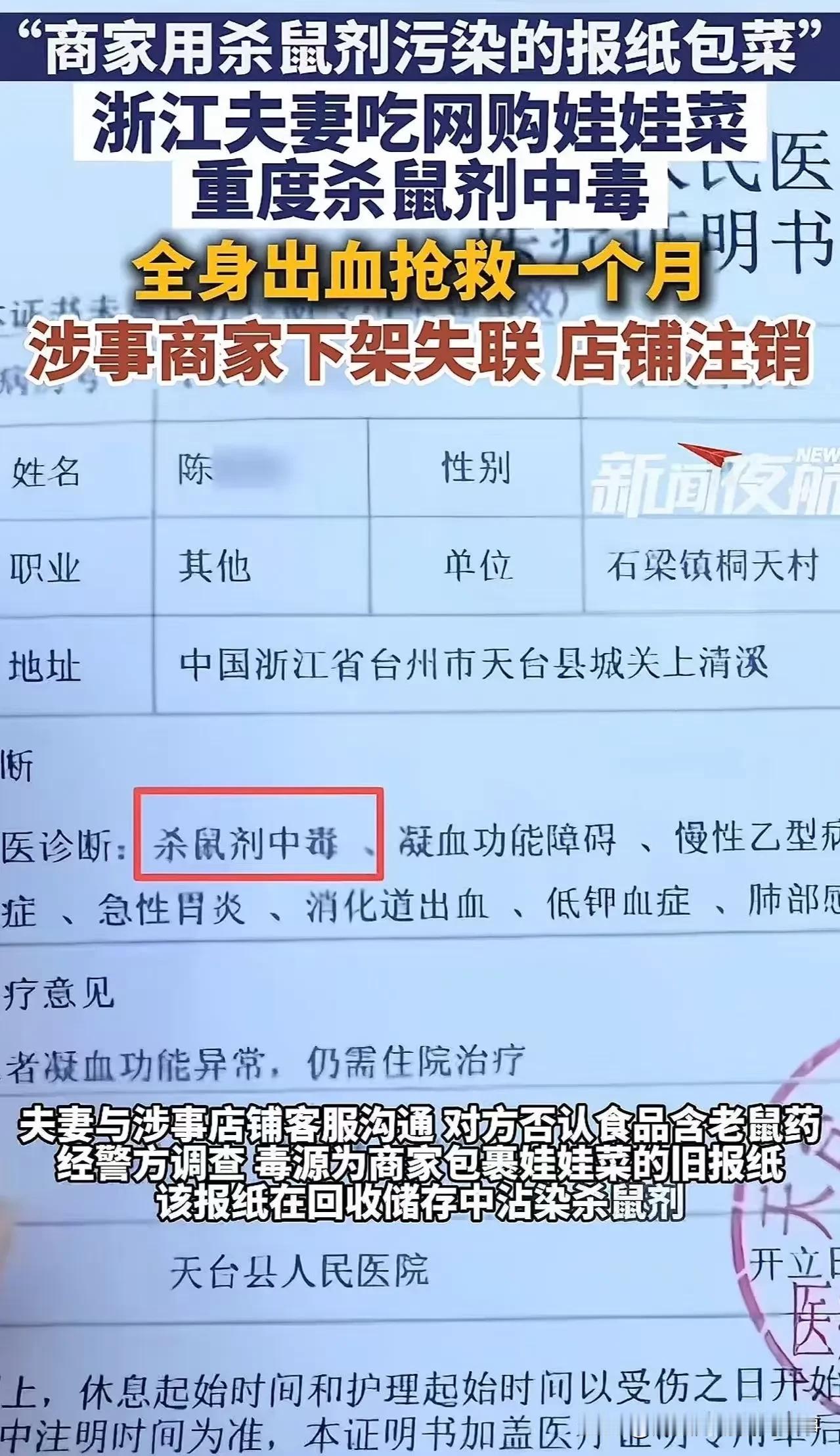 这起事件的毒源是旧报纸包装,而非种植环节农残,暴露了网购生鲜“最后一公里”的包装安全盲区,更敲响了食品安全全链条管控的警钟。 一、事件核心 1. 2025年12月,浙江台州杨女士夫妇网购8斤娃娃菜,清水煮熟食用后出现流鼻血、口腔血泡、流血不止等症状,被确诊为溴鼠灵(抗凝血杀鼠剂)中毒,双双进ICU,妻子昏迷月余,丈夫出现肺积水、呼吸衰竭等危重情况 。 ​ 2. 警方查明:涉事商家为压缩成本,用回收储存时沾染溴鼠灵的旧报纸包菜,毒物渗透污染蔬菜;溴鼠灵热稳定性强,水煮无法破坏,常规清洗难清除 。 ​ 3. 涉事店铺已注销,平台配合调查,警方正追查全链条责任 。 二、溴鼠灵中毒与急救 1. 中毒特点:潜伏期数小时至数天,初期症状不明显,一旦发病会破坏凝血功能,导致广泛性出血,严重时内脏出血、休克、多器官衰竭。 ​ 2. 急救要点:立即拨打120;携带剩余食物/包装供医生判断;禁用催吐(尤其意识不清者);特效解毒剂为维生素K1,需尽早使用。 三、食品安全保障与消费者防范 1. 监管层面:需强化生鲜包装材料合规性审查,严禁用回收污染旧报纸等非食品级材料包装;平台要落实商家资质审核与抽检责任,建立溯源机制。 ​ 2. 消费者防范: ​ - 网购生鲜优先选正规商家,警惕不明包装; ​ - 包心类蔬菜(娃娃菜、大白菜)剥除外层叶片,内层逐片掰下,流动清水浸泡搓洗; ​ - 食用后出现异常出血,立即就医并保留剩余食物样本。 四、维权路径(留存订单、物流记录、检测报告、沟通截图) 1. 与平台协商,要求先行赔付; ​ 2. 向12315或市场监管局投诉,主张商家、平台承担连带责任; ​ 3. 必要时提起诉讼,要求赔偿医疗费、误工费等,可主张惩罚性赔偿毒食品 农残农药 农残超标食品 素材来源于网络,侵权删除。