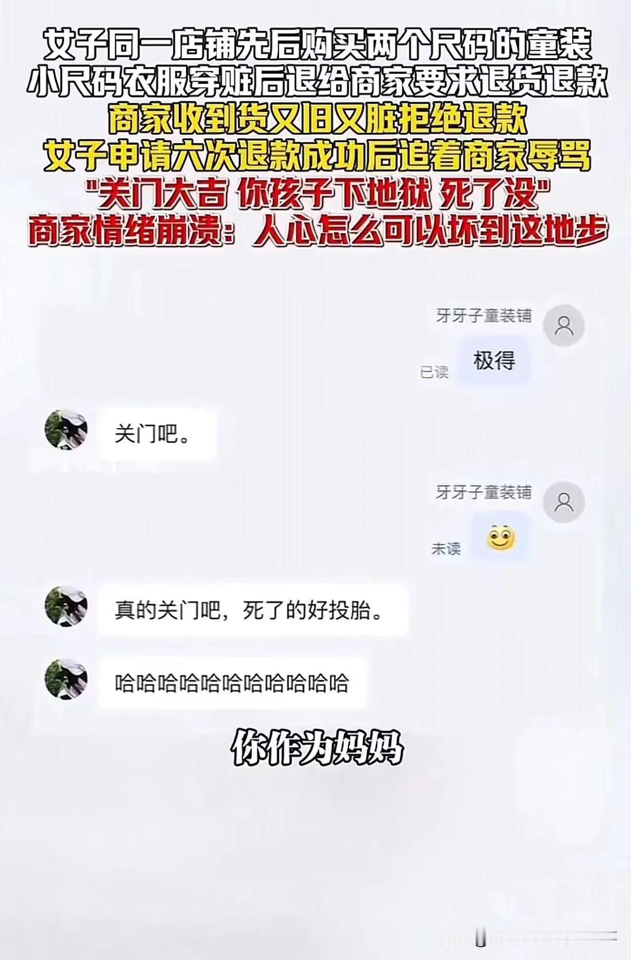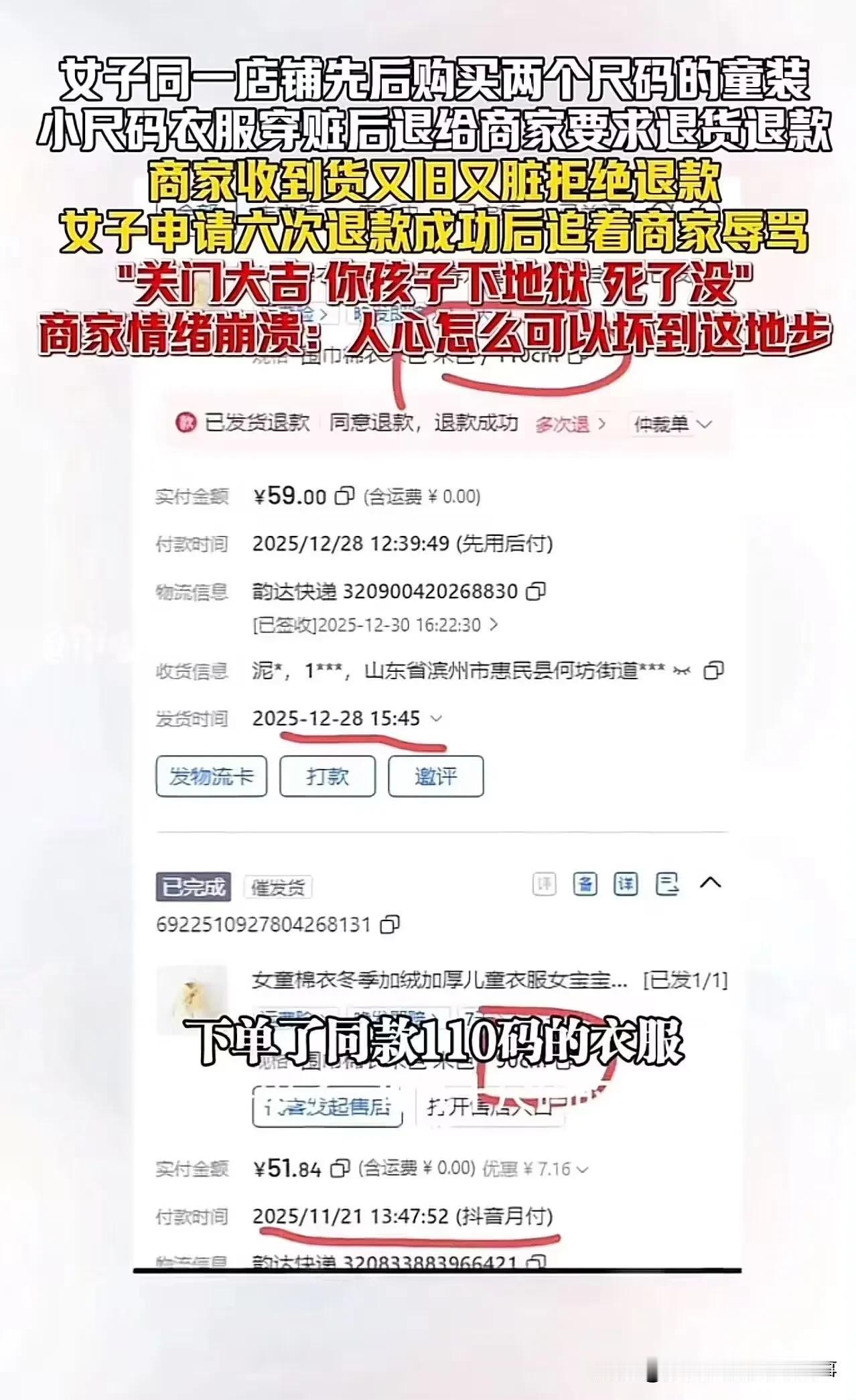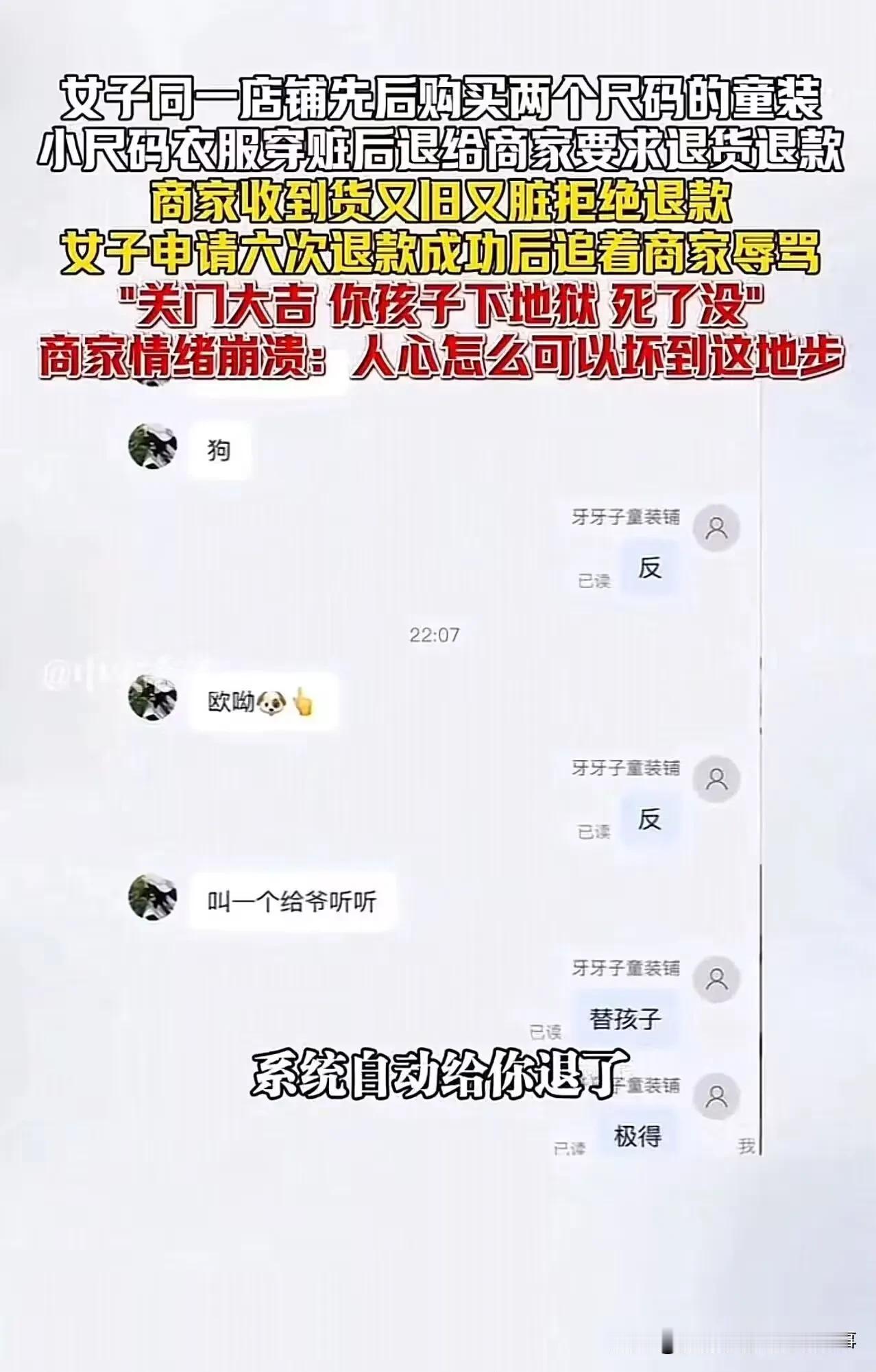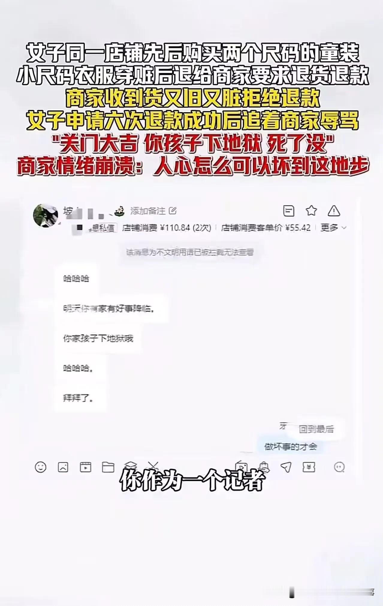 穿脏穿旧退货已是恶意白嫖,辱骂诅咒更是突破道德底线,记者身份更显讽刺——本该守底线传正义,却用恶行践踏规则、伤害他人,双标又缺德。 白嫖是贪小利失人品,辱骂诅咒则是恶语伤人,既违退货规则,更失做人良知,作为妈妈如此行事,给孩子做了最坏示范。 商家拒退合理合规,不惯着恶意退货是自保,网友共情不是护商,是守规则底线,这种突破良知的行为,不配被包容。职业打假争议 退货潜规则 网购白嫖 素材来源于网络,侵权删除。