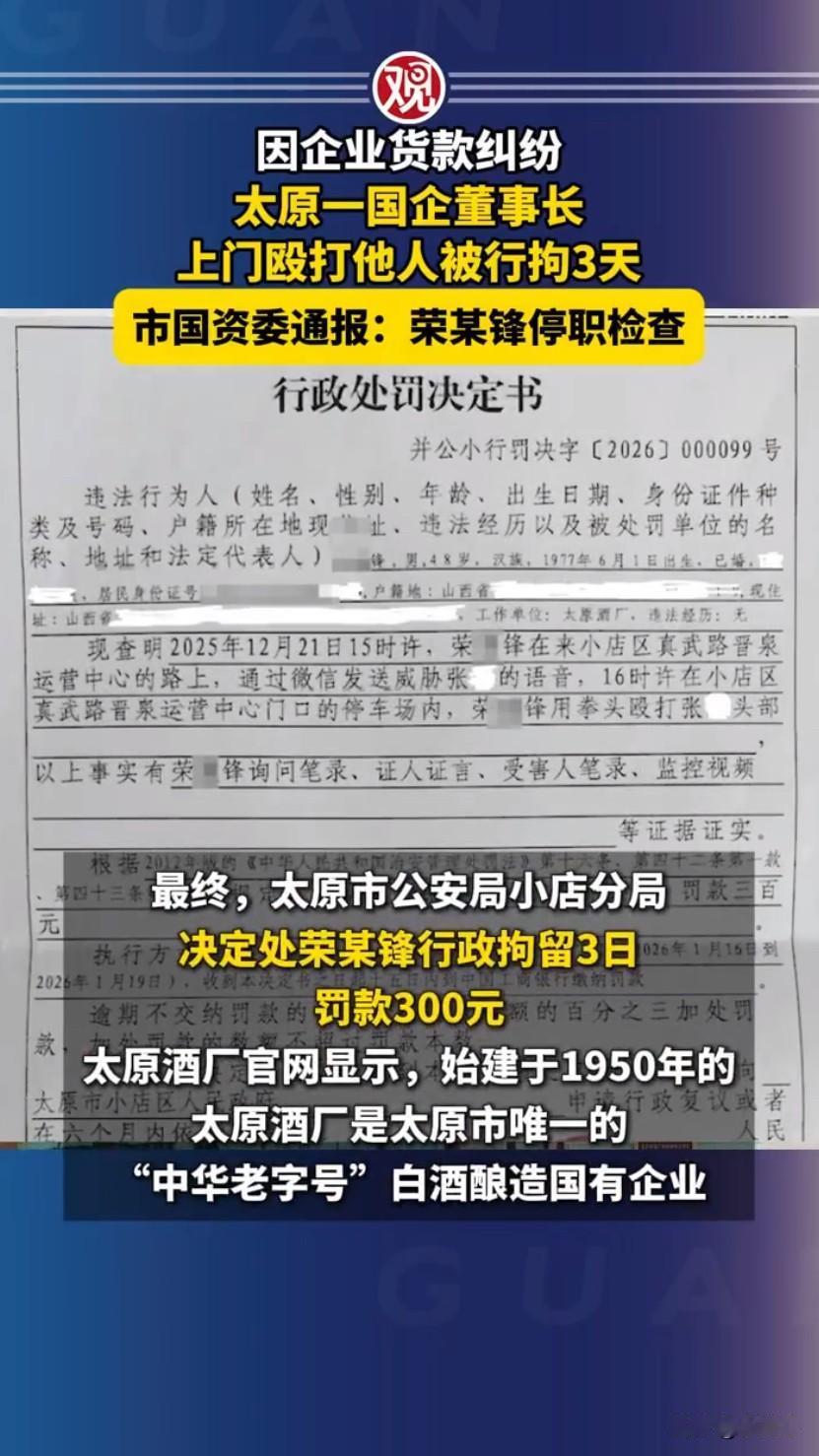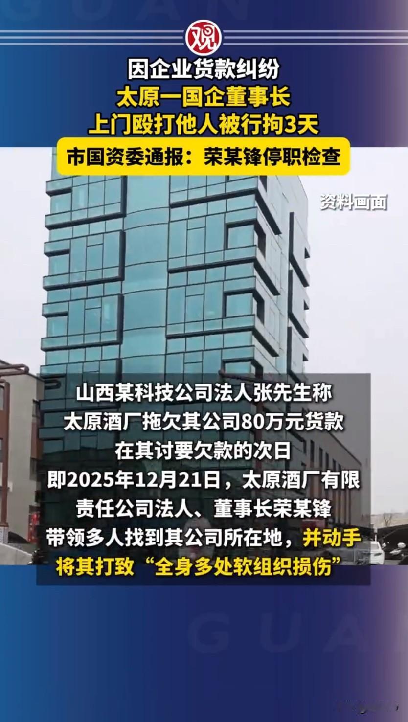 太原一位国企酒厂董事长因为货款纠纷,直接上门殴打合作商还被行拘的事,直接冲上了热搜,堂堂国企负责人,不靠协商解决问题反而动手打人,这事看了真的让人匪夷所思。这位涉事的荣某锋是太原酒厂的董事长,这家酒厂还是当地唯一的中华老字号白酒国企,本应守着诚信经营的底线,结果却连合作方的货款都拖着不还,还闹出了打人的事。事情的起因是张先生的公司从2022年开始就和太原酒厂合作,帮着经销酒厂的酒类产品,前期合作一直都挺顺利,可后来荣某锋突然口头通知终止合作,张先生这边就要求退还之前预付的货款,结果还有80万左右的款项,酒厂那边一直拖着不给,多次讨要都没结果。就在张先生去酒厂当面要账,还说再不给就向上级部门反映的第二天,荣某锋就带着人找上了门,出发前还特意发微信语音威胁张先生,等张先生到了公司门口的停车场,荣某锋直接动手,用拳头殴打张先生的头部,随行的人也跟着一起,最后把张先生打得全身多处软组织损伤,好好的要账变成了被打,任谁遇上这事都得窝火。事发后张先生报了警,警方经过调查核实,对荣某锋作出了行政拘留3天、罚款300元的行政处罚,可面对记者的采访,荣某锋不仅拒绝回应,还多次挂断电话,一点都没有意识到自己的问题。这事在网上传开后,也引起了太原市国资委的高度重视,作为酒厂的全资控股方,国资委第一时间组织调查,确认荣某锋因货款纠纷殴打他人的行为属实后,立刻发布通报对其作出停职检查的处理,还责成纪检监察组和公安部门开展专项调查,同时派工作组进驻酒厂,保障企业的正常生产经营。大家之所以对这事议论纷纷,不只是因为荣某锋动手打人的行为太恶劣,更因为他国企董事长的身份,国企本应是市场中的表率,守法律讲诚信是基本要求,可荣某锋却带头拖欠货款,还用暴力手段解决商业纠纷,不仅触犯了法律,还让国企的公信力受了损。商业合作本就是愿打愿挨,就算有纠纷,也有协商、起诉等多种合法途径可以解决,可荣某锋却选择最极端的方式,仗着自己的身份为所欲为,最终也为自己的冲动和蛮横付出了代价。这起事件也给所有企业负责人提了个醒,不管身处什么位置,遇到问题都不能突破法律的底线,合法合规才是解决问题的根本,更何况是国企,更该守住底线,维护好自身的形象和公信力。老板和员工纠纷 国企董事长上门打人被停职 来源:观察者网