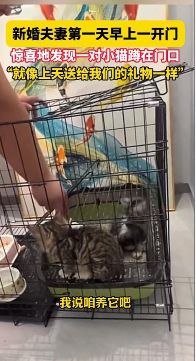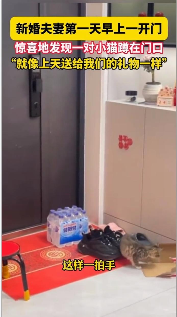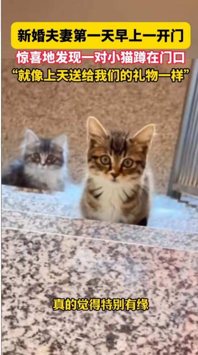 黑龙江绥化新婚夫妻开门红!两只小猫蹲守门口送“贺礼” 1月25日清晨,黑龙江绥化的寒气还裹着年味,袁女士和丈夫刚解锁“婚后第一天”成就,一开门就被门口的景象整懵了。 俩毛茸茸的小家伙正乖乖蹲在脚垫旁,浅灰色绒毛沾着霜花,圆溜溜的眼睛像两颗带雾的黑葡萄,直勾勾盯着这对新人。“当时脑子瞬间空白,还以为是亲友送的奇特贺礼!”袁女士笑着回忆。 丈夫试探性拍了拍手,没想到这对“猫界小夫妻”毫不认生,扭着胖乎乎的身子就往屋里钻,小爪子踩在地板上发出哒哒的轻响,活像俩持证上岗的家庭新成员。 袁女士赶紧掏出手机记录这份惊喜,发完视频下楼时,却见俩小猫缩在楼梯间瑟瑟发抖,小鼻子冻得通红。她翻出家里的牛奶和饼干,俩小家伙狼吞虎咽的模样,一看就是饿坏了——后来才知道,它们怕是饿了一整天,凭着嗅觉爬上十楼找活路。 “猫来财,双猫进门更是双倍福气!”夫妻俩对视一眼,当场拍板收养。袁女士笑称:“新婚礼物千千万,这般天赐的缘分最稀罕,以后咱也是四口之家了!” 视频走红后,网友们的评论比东北的暖气还热:“这哪是流浪猫,分明是送子观音派来的‘双胞胎代言人’!”“十楼都能找到,这猫界导航也太精准了” 。更有人感慨:“最好的婚姻,就是和爱的人一起,把温柔分给需要的小生命。” 如今俩小猫成了家里的“团宠”,袁女士夫妻俩连窗户都不敢轻易开。这场寒冬里的意外邂逅,让新婚生活刚开篇,就写满了温暖与欢喜。贺年的小猫 新婚第一月 新婚之夜送礼