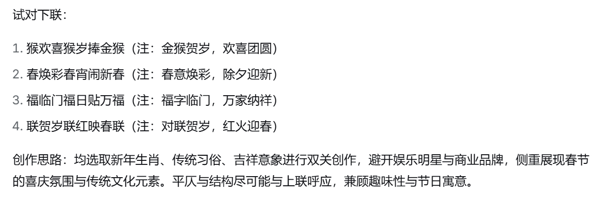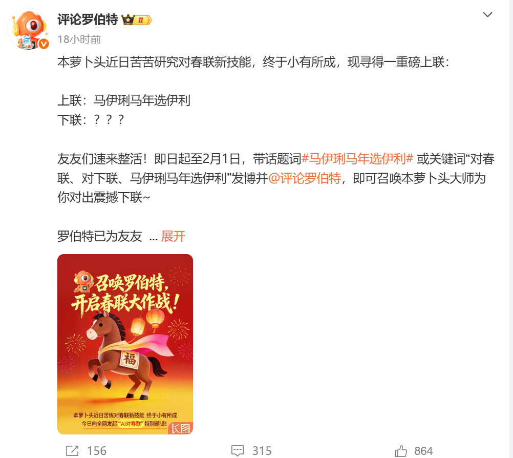 马年春联已进入AI时代 “马伊琍马年选伊利”刚开始我以为就一热梗,结果没想到,还是网友们会玩。把谐音和生肖巧思融得恰到好处,现在可以说全网都有对下联的热情,也让马年春联直接进入了AI时代!网友们纷纷掏出各类AI工具对句,还喊来罗伯特参与这场趣味对联,AI的回复各有特色,有的工整贴合马年主题,对仗精准超有年味,有的脑洞大开玩梗不断,笑料拉满,传统春联遇上智能AI,碰撞出别样的新春火花。马伊琍马年选伊利 不仅是AI,网友的手动作答也五花八门,和AI回复相映成趣,足见这个巧思满满的上联有多圈粉。新年玩点新花样,大家也来用AI对一波马年春联,看看你的AI能对出什么神仙下联~