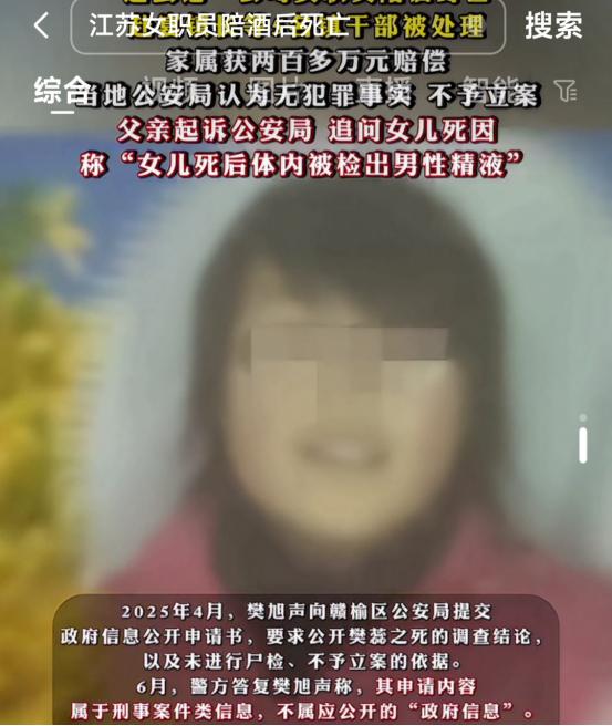 连云港,一名女子和公司老板聚餐后,醉得不省人事,被老板带到房间内发生了关系。岂料,第二天女子死在了房间内。事后,警方以两人系情人关系为由,不予立案。老板想息事宁人,先是赔付女子家属135万元,后又额外赔偿给女子的弟弟100万元。女子的父亲却始终心里有个疑团,他向公安局提交了政府信息公开申请,却被警方拒绝了。女子父亲一气之下,将公安局起诉到法院。   “死者体内检测出男性精液,刘某也说和您女儿长期保持亲密关系,所以两人应当是情人。”当警察对樊蕊父亲说出这句话时,樊父只觉得一阵晕眩。   难道就这样一个轻飘飘的结论,就能给女儿的死画上句号吗?   他女儿樊蕊,34岁,已婚多年,生前在公司做办公室主任,平时连微信都很少和异性聊天,怎么突然就成了老板的“情人”?   事情还要从2024年2月23日晚说起。樊蕊被公司老板刘某叫去陪镇上几位干部吃饭。饭局设在公司食堂,五名镇干部到场,其中两人是女性,没喝酒;其余人喝的是白酒。   樊蕊作为唯一陪酒的女员工,在短时间内连敬四杯,很快醉得站不稳。刘某体贴的把人扶进办公室休息,随后独自返回。然而第二天上午,樊蕊被发现死在房间内,初步死因是酒精中毒。   可更让家属震惊的是,尸检中竟检出了刘某的精液。面对质疑,警方没有深入调查性行为是否发生在樊蕊清醒状态下,而是直接采纳了刘某“两人是情人”的说法,认定“无犯罪事实”,不予立案。   而刘某为了平息事态,先赔了135万元,又私下给樊蕊弟弟100万,总共235万元。钱到账了,但疑问却越来越多:既然是“情人”,为何聊天记录中没有任何蛛丝马迹?既然关系亲密,为何事发后第一反应是赔钱而不是解释?   樊父越想越不对劲。他记得女儿肚脐以下有明显淤青,法医却未做详细尸检;公司和镇政府的监控“恰好”全部故障;他多次申请查看完整调查材料,都被以“属于刑事案件信息,不能公开”为由拒绝。   可问题是,案子根本没立成刑事案件,何来“刑案信息”一说?   2025年,沉浸在丧女之痛中的樊父把公安局告上法庭,只求一个真相:“我不是要钱,我只想知道,我女儿在最后那一刻,是不是被迫的!”   然而令人感到不安的是,明明存在这么多疑团的案件,处理过程竟然如此“高效”:干部受处分,是因为违规吃喝;老板赔钱,是为了息事宁人;警方结案,是为了避免麻烦。   唯独没人认真问一句:樊蕊到底经历了什么?   如今,法院还没宣判,但这场诉讼已经撕开了一道口子。或许我们永远无法完全还原那个夜晚的细节,但至少该记住:用“情人”两个字草率定性一段明显不对等的关系,是对逝者的二次伤害,更是对职场女性安全的蔑视。   对此你有什么看法?欢迎在评论区留言讨论。职场女性 陪酒   信息来源: 中安在线2025.11|《陪酒身亡女职员体内检出精液,警方不予立案引质疑,父亲起诉警方想要真相》 文|墨海 编辑|史叔
