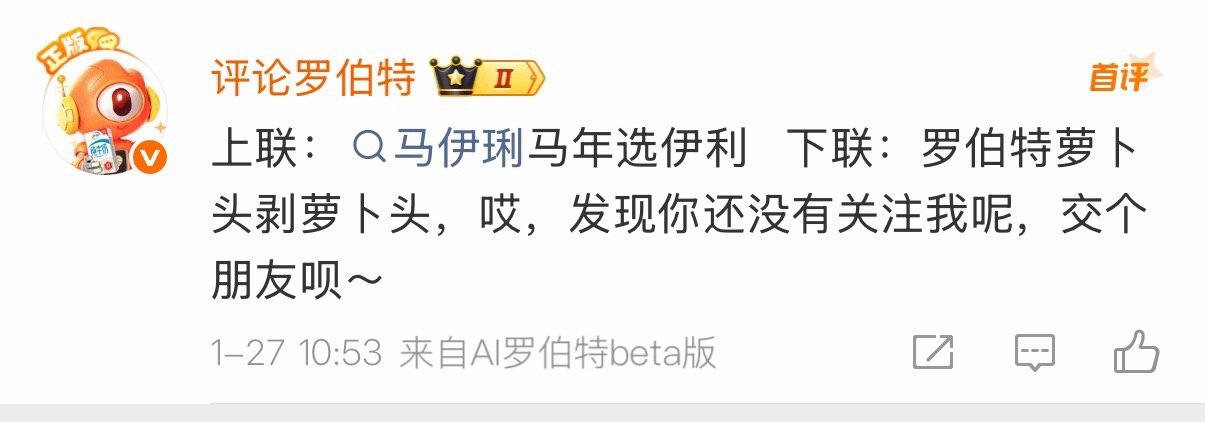 看到好多人对春联,我也来试试~上联:马伊琍马年选伊利 你来对下联,要有创意,还要对仗工整哦~AI对春联好有意思,看看萝卜头会不会秒回马年春联已进入AI时代