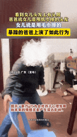 “这样的父爱不要也罢”! 就因为看见女儿头发上有头屑,怀疑孩子用纸擦头,广东这位老爸直接炸了,摔东西、踹椅子,一个大老爷们,怎么干娘们的事呢。 孩子就辩解了一句,吓得赶紧躲进房间锁门,这哪是管教孩子,分明是拿孩子撒气啊! 1月26号,广东一户人家的监控拍下来这揪心的一幕。女孩刚洗完头,正坐在客厅吹头发,她爸路过瞅了一眼,看见她头发上有头屑,当场就断定孩子是用纸巾擦头,伤了头皮。女儿赶紧小声说自己是用毛巾擦的,就是没清理干净头屑,结果这话直接把她爸的火气点燃了。 他二话不说抓起手边的吹风机,“哐当”一声狠狠砸在地上,吹风机直接碎了。接着又抬脚把女儿坐的椅子踹翻,客厅里的东西被他随手乱摔,然后对着女儿锁上的卧室门疯狂踹砸,哐哐的踹门声、东西碎裂声,听得人头皮发麻。 女孩躲在门后连哭都不敢大声,那下意识锁门的动作,一看就是被吓出来的本能反应啊! 站在她爸的角度想,可能是觉得用纸擦头不卫生还伤头皮,想管管孩子,可没控制住脾气,把小事闹大了。 但对孩子来说,就是被无端怀疑,想解释一句,结果迎来一顿打砸,满心的委屈和害怕,根本没处说。 从小在这种环境里长大,孩子真的遭罪!可能会变得特别自卑,总觉得自己做什么都不对,长大后别人稍微说她一句,她就容易崩溃。 也可能变得不敢说话,遇到委屈只会憋着,连反驳的勇气都没有;甚至可能学着她爸的样子,以后自己也爱乱发脾气,或者害怕谈恋爱、组建家庭,觉得亲密关系太可怕了。说白了,这种伤害真的能记一辈子。 这事被发到网上后,大部分人都骂这位老爸:“管孩子也不是这么管的,分明是自己情绪失控拿孩子撒气!”“孩子的安全感全被这顿打砸毁了!”也有少数人说,可能她爸平时压力太大了,就是找错了发泄的方式,可再难,也不能冲孩子撒火啊! 想想真的心疼这孩子,家本来该是孩子的避风港,怎么反倒成了让她害怕的地方?就因为一点鸡毛蒜皮的小事,就对着孩子又摔又砸,这给孩子心里留下的阴影,哪是一句“我错了”就能弥补的?当爸妈的,连自己的脾气都管不住,还怎么教孩子好好说话? 你觉得这位老爸的做法能理解吗?