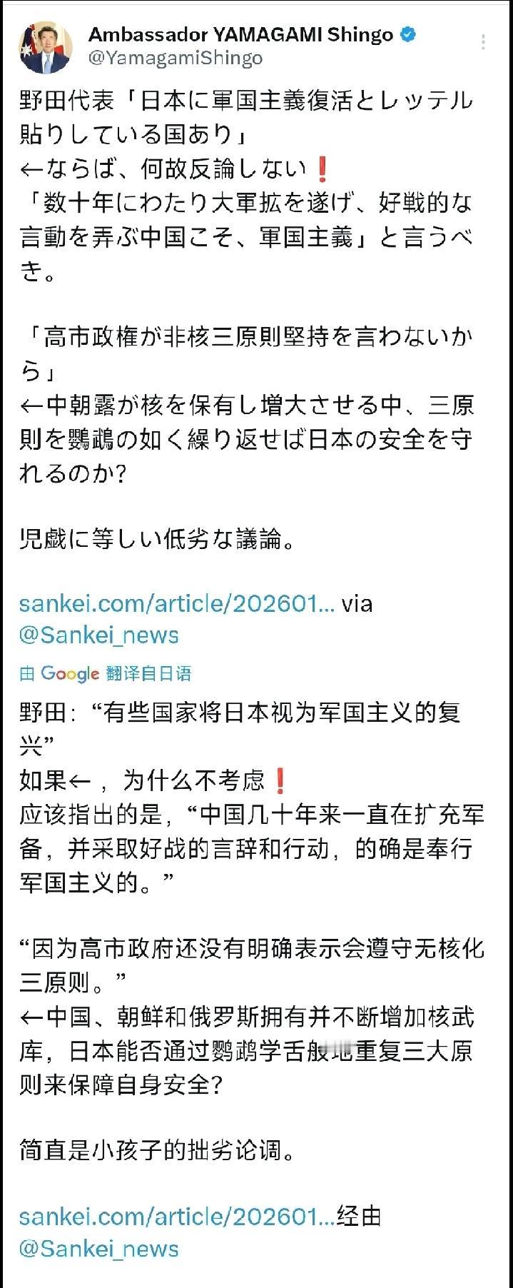 日本大使,倒打一耙 今天一月二十七日,日本驻澳大利亚大使,山上信吾,发文:“野田佳彦代表,有些国家给日本贴上军国主义复活的标签,那为什么不反驳? 几十年来,进行大规模军备扩张,玩弄好战言论的中国才是军国主义。 因为当前政权没有说坚持无核三原则,在中朝俄拥有并扩大核武器的情况下,像鹦鹉一样重复三原则就能保卫日本的安全吗? 近乎儿戏的低劣议论。” 个人认为:日本驻澳大利亚大使,可以说是日本的精英了吧,而这样的人物污蔑抹黑中国,可见不是个例,代表着大部分日本人的所思所想所感。 日本驻澳大利亚大使-山上信武如此疯狂,极端恶意的颠倒黑白,倒打一耙的叫嚣。 只能说明中国的反制还不够强度,也正说明中国的打击方向正确,命中了痛点,但无法造成伤害。 所以才导致了这种情况的出现。 个人认为,能否将反制手段多样化,深入化。不然什么样的小鬼子都会出来叫嚣,显示自己的存在感。