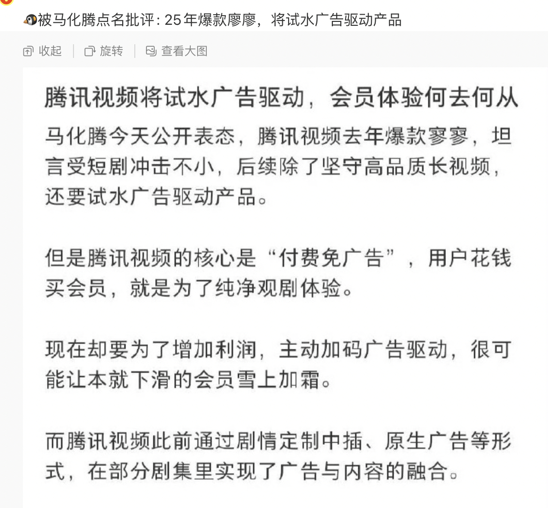 马化腾公开点名批评腾讯视频没有爆款,但也要试水广告驱动产品,这是要腾讯视频的老命吗?