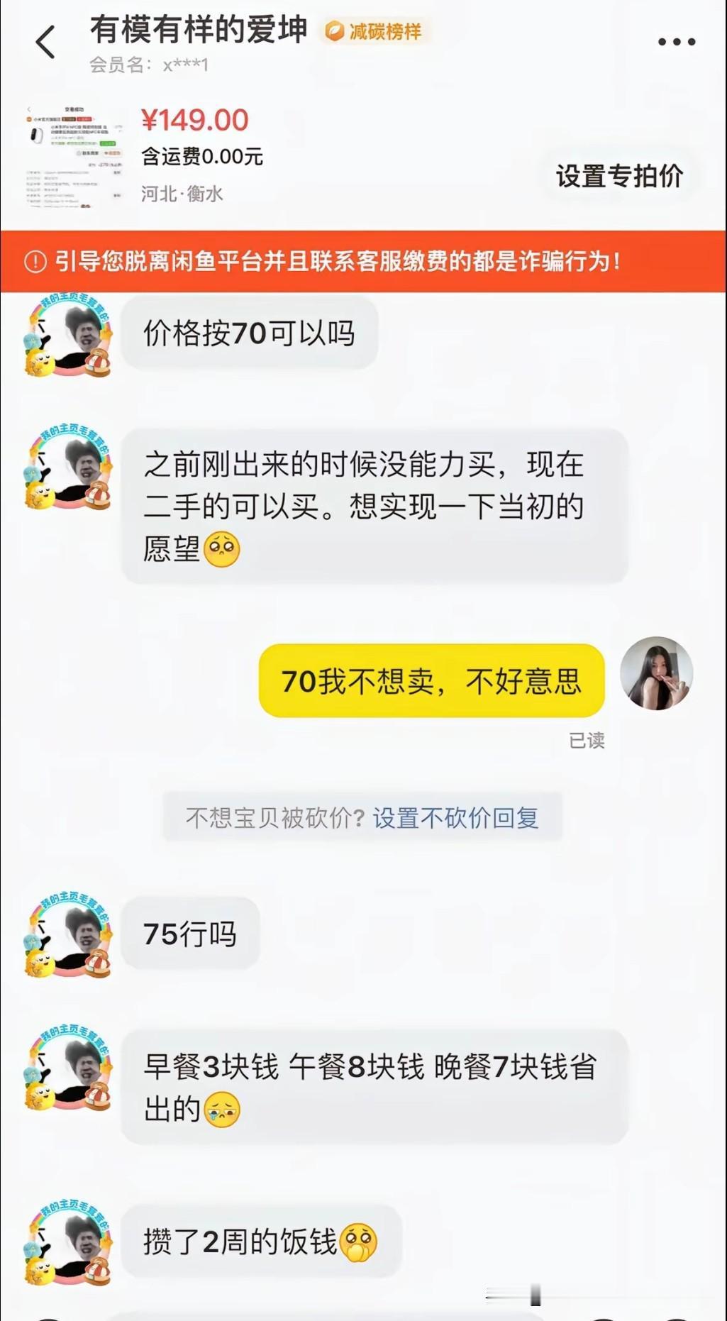 二手平台有很多倒爷,他们经常冒充省吃俭用、勤工俭学的学生或者落魄打工人狮子大砍刀,直接把你几百块钱的东西砍到几十块钱,同情心泛滥的人觉得几十块钱也是钱,就同意改价发货了,这些倒爷就会拿到自己的小号高价售卖,你35卖出去的,他100卖给别人…… 本质上他们还是借助信息差和资源整合来赚取差价的二手电商从业者。他们的核心玩法是低买高卖,常见路径有两种:一是在低价平台批量采买母婴用品、数码配件这类高频刚需品,再挂到二手平台加价转售,有人下单就直接让上家代发,完全不用囤货;二是瞄准小众稀缺品,比如绝版手办、断码品牌服饰,通过蹲守个人卖家的低价闲置,转手卖给有迫切需求的买家。 如何识别这些倒爷呢?前面说的很清楚了,喜欢打同情牌,先卖惨,再大砍价,巴不得你免费包邮送给他。一次砍价不行,还有二次加价,三次砍价等等,而且回复很快,基本24小时在线,有些倒爷运气不好得到了一些差评,他们一般都会狡辩。 这也是为什么有些人的主页宝贝参差不齐,宝贝价格而且虚高的原因,别人38块钱能卖的宝贝,他们统一把价格抬到98块钱,真心想买的因为信息差买不到,就只能成为大冤种了。