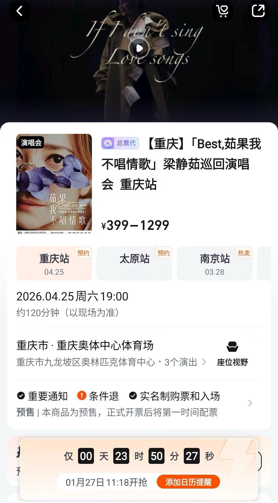 梁静茹巡演重庆站抢票 这次,我们不只是在抢一张演唱会门票,更是在预订一个万人级别的“情绪释放舱”。在重庆的春夜里,把积攒的开心、遗憾、释怀统统交给她的歌声。今天11:18,目标:拿下这张通往共鸣现场的通行证。