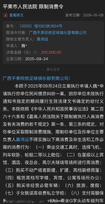 中甲联赛 昨天说平果搞新球队要注意规避FIFA判定继承,今天看到他们女足的案子,打听了下,呗哝女足冲超成功要继续玩,但他们这个俱乐部借私人钱导致法人被限高也是醉了,平果足球就此也达成了男、女足俱乐部公司法人双双被限高的成就男足他们要搞破产清算的,之前大钱就不说了,餐厅的钱还欠着,过去1年的俱乐部过生日订蛋糕的钱也欠着,男足俱乐部法人也是个顶在前面的普通人,很惨,之前就被限高了。