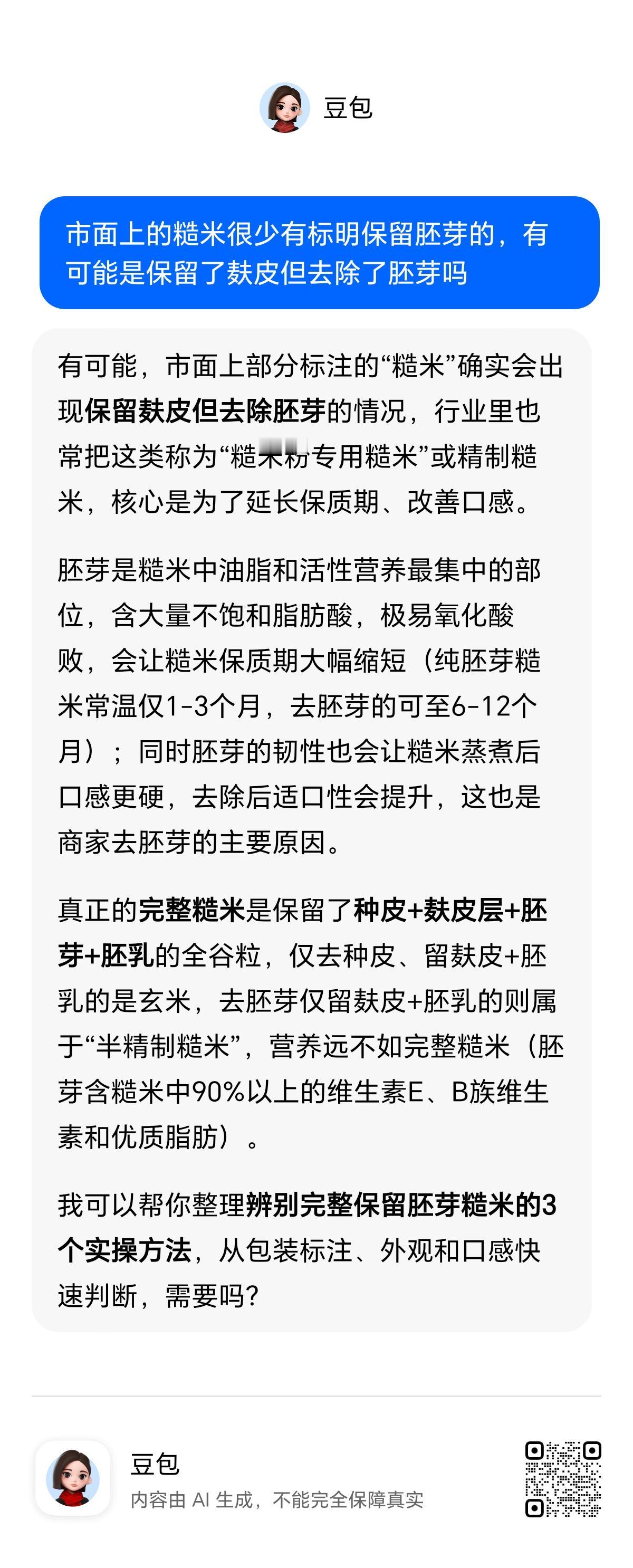 看了一圈网购平台,只有少量糙米和小米才标明保留胚芽,其他都是假全谷物。但是含胚芽的谷物虚人未必承受得住,比如鲜玉米或者玉米浆包就是天然保留胚芽的,有些人吃了明显不舒服。要是买到标明胚芽的谷物,先试吃30克当夜不做差梦噩梦再加量。