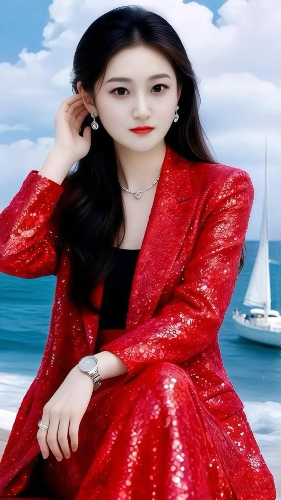 海边红色西装美女,闪耀的耳环和项链,与蓝天白云和帆船相映成趣,美不胜收!🌊💃✨