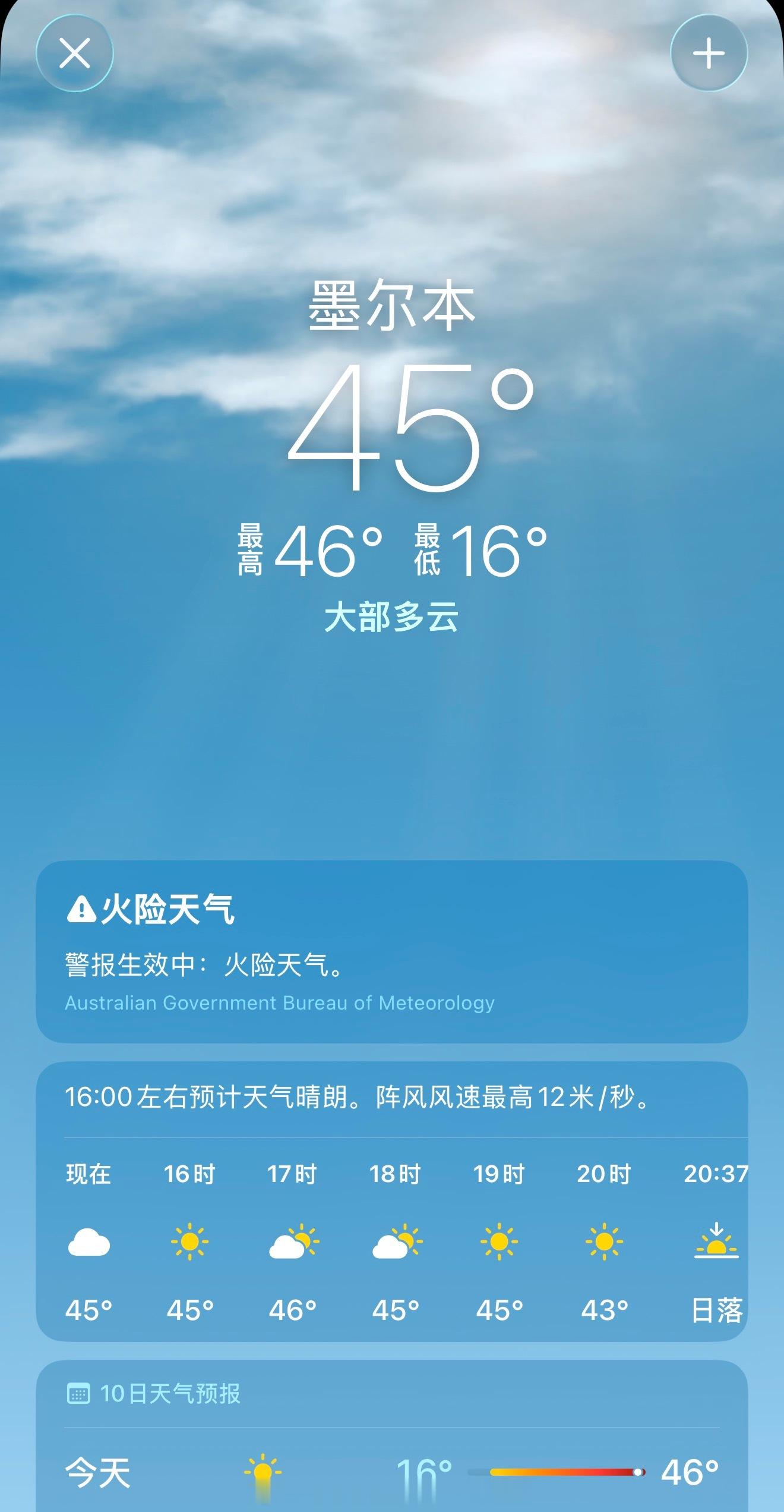 墨尔本此时温度45度,在现场的宝宝们尽量不要在外面走动。一天30度的温差真的很恐