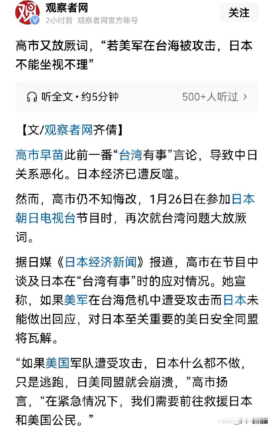 不要有什么期望了, 高市早苗还是以前的高市早苗, 1月26日,高市早苗再次表示,“如果美军在台海危机中遭受攻击,日本不会坐视不理”。 这是继上一次抛出“台湾有事,就是日本有事”之后的又严重挑衅言论。 看来高市早苗是不会在这个问题上妥协了,我们也应该知道问题的严重性,做好一切准备吧。