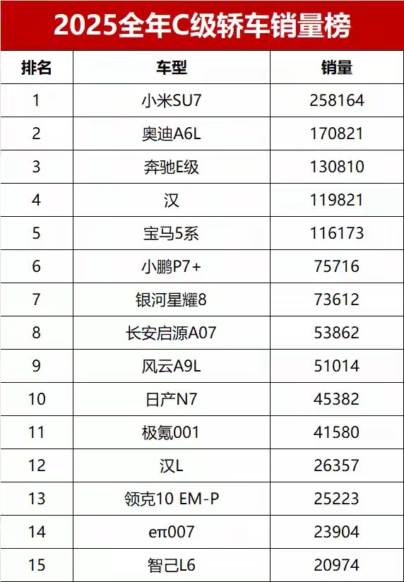 不知道大家有没有发现,去年的C级车市场发生了翻天覆地的改变,传统的燃油车仅剩下BBA来撑场面了,而且BBA每个品牌仅有一款车上榜,剩下的几乎都是国产新能源了。