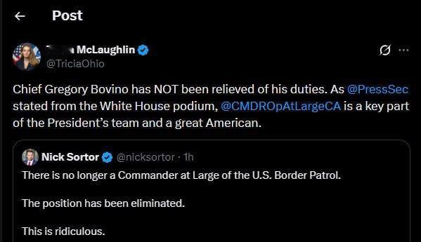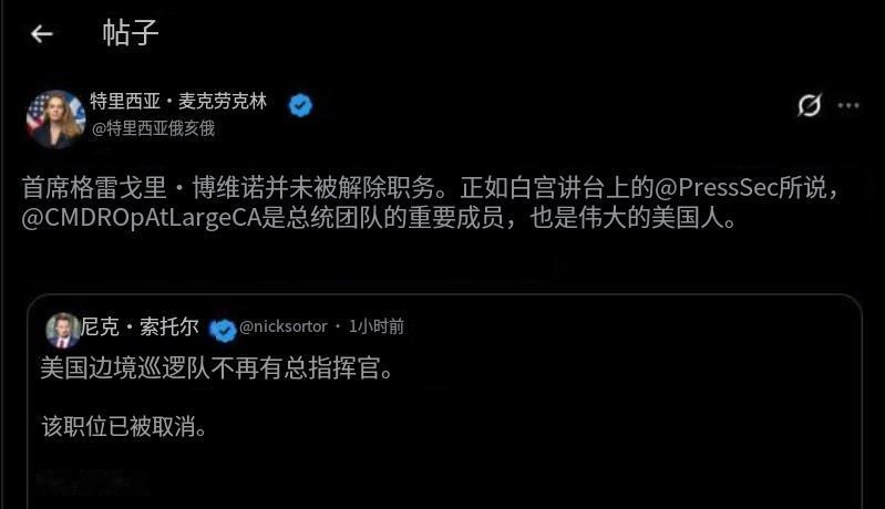 博维诺不离队,特朗普紧急与国土安全部会商,服软挽回民意是大事 之前媒体报道普雷蒂被枪杀事件后边境巡逻队长格雷戈里·博维诺被解除职务的消息,目前证实仍然在职,但将被调离。 美国国土安全部发言人特里西娅·麦克劳克林在社媒平台明确表示,边境巡逻队长格雷戈里·博维诺“并未被解除职务”,仍然是特朗普总统团队的重要成员。 实际特朗普只是将其调离。据三位熟悉此举的消息人士透露,边境巡逻指挥官格雷戈里·博维诺及其部分ICE特工预计很快将离开明尼阿波利斯地区。 之前哥伦比亚广播公司新闻(CBS News)和路透社报道,有多名国土安全部(DHS)官员和知情人士确认,1月26日正式将博维诺降职处理。 博维诺之前担任边境巡逻队长,原本由国土安全部长克里斯蒂·诺姆(Kristi Noem)直接任命,负责监督特朗普第二任期内针对大城市的大规模移民突袭行动。 负责包括洛杉矶、芝加哥和明尼阿波利斯的“中途闪电行动”(Operation Midway Blitz)等高调行动。 1月24日(周六)上午,边境巡逻队特工在明尼阿波利斯将37岁的重症监护室护士亚历克斯·普雷蒂(美国公民、退伍军人医院工作人员、持有合法隐蔽携枪许可)射杀,引发大规模民众抗议。 普雷蒂被杀事件影响越来越大,民主党领袖舒默明确表态不再与共和党合作,共和党人德克萨斯州共和党参议员特德·克鲁兹、犹他州共和党参议员约翰·柯蒂斯等人对特朗普团队对枪击事件处理公开表示不满。 枪击案发生数小时后,国土安全部长克里斯蒂·诺姆指控普雷蒂持枪并“激烈抵抗”。但视频显示,普雷蒂被特工接近时举起的是手机,而不是枪。 白宫副幕僚长斯蒂芬·米勒称普雷蒂为“未遂刺客”和“国内恐怖分子”,但未提供任何证据,边境巡逻队指挥官格雷戈里·博维诺指责普雷蒂试图“屠杀执法人员”,但都缺乏证据。 据《纽约时报》报道,唐纳德·特朗普总统在椭圆形办公室与国土安全部长克里斯蒂·诺姆及其首席助手科里·莱万多夫斯基会面近两个小时。 调查显示,只有39%的美国人认可特朗普在移民领域的工作,移民政策在特朗普一月就职后的几周内对其人气更为积极,二月份有50%支持,41%反对。 其中约58%的受访者认为ICE移民官员的镇压“过于过火”,26%认为这些特工的行为“大致正确”。 特朗普要尽快平息这次事件,挽救他正在下滑的支持率。