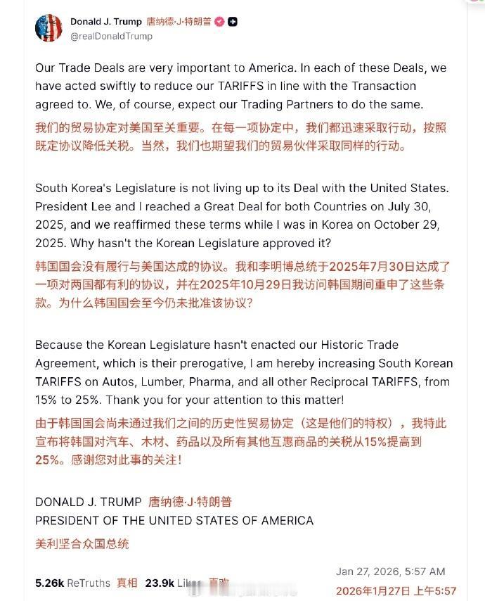 特朗普终于醒悟过来自己被日韩忽悠了,美国总统特朗普于美东时间1月26日在真实社交发文,由于韩国国会未能通过美韩贸易协议并正式入法,美国将针对韩国输美汽车、木材与药品及其他对等关税项目的税率由15%增至25%。韩国的王冠白送了。 之前特朗普和多个国家达成协议,签了一堆动不动就在美国投资几百上千亿的所谓文件,结果其实一个也没达成,都是哄着特朗普开心,反正就是个意向,等你老特下台了,这协议也就作废了。 特朗普也顺势把关税降下来,否则全球国家都收高关税,美国老百姓还过不过了,正好找个台阶,总之就是赢了,为美国迎来了几千亿美元的投资。 结果现在开始反噬了,韩国第一个揭开了这个谎言,特朗普挂不住了,要制裁提高关税,否则所有签了协议的国家都反悔,那就丢脸丢大了。那之前沙特阿联酋之类的要投资美国1万亿美元的怎么办。 还有日本投资美国的5000亿美元,这下子还怎么赖掉呢,高市早苗有的头疼了。 现在的特朗普有点内外交困的感觉,内有ICE掀起的动乱,外有加拿大率先举起反美大旗,下面英国、德国都要争相访华,心累,80岁的老人了,一天天的发上百条推特,怼完这个怼那个,感觉快镇不住了。