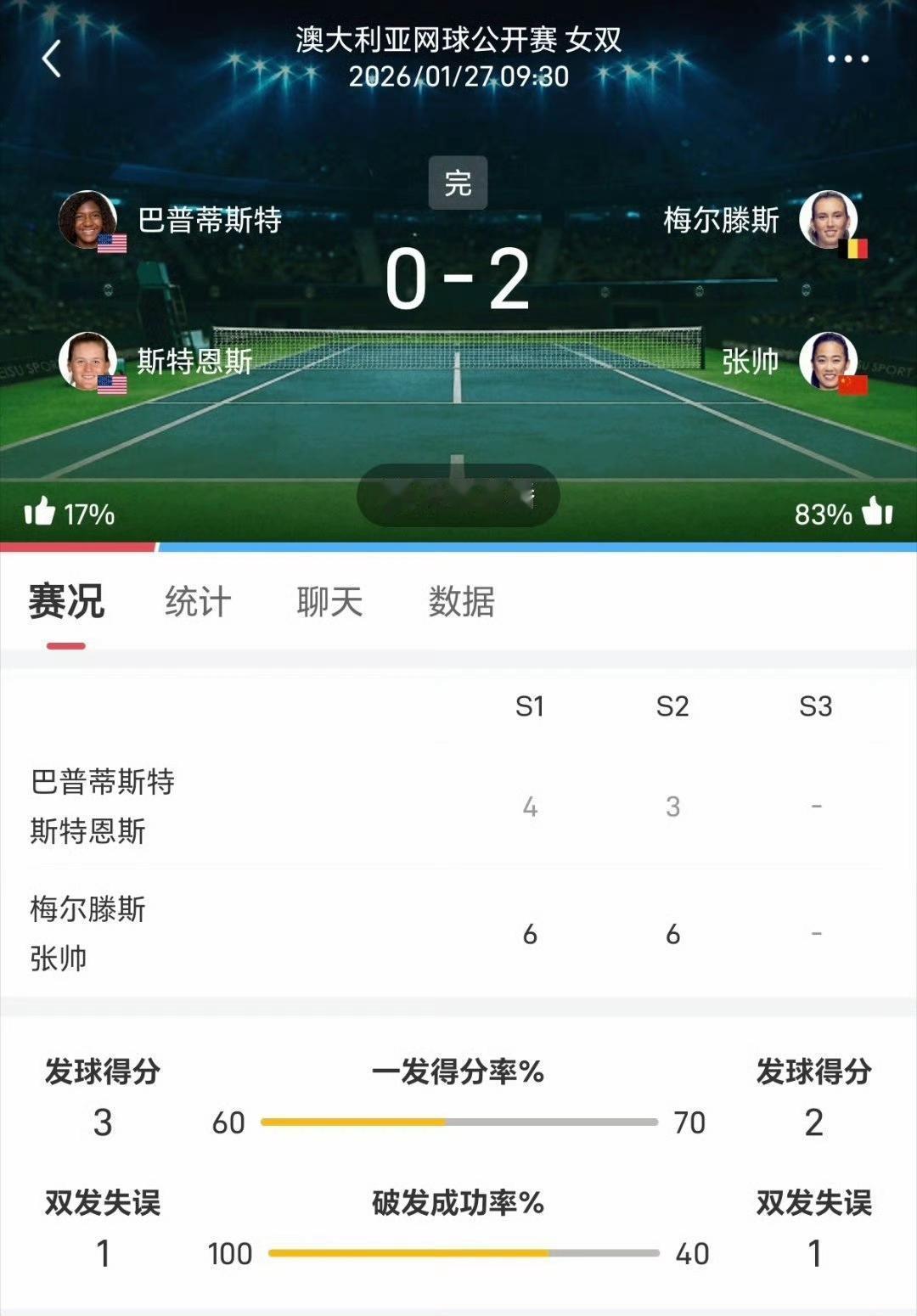 这个家不能没有帅姐!大难不死必有后福,中国独苗张帅的故事还在继续,这是要挺进决赛的剧本…… 2026澳网女双第三轮,上一轮逃过三个赛点的4号种子张帅/梅尔滕斯,这次以6-4/6-3击败巴普蒂斯特/斯特恩斯,锁定最后一个八强席位。 张帅组合在下半区,这阵容突围有望。
