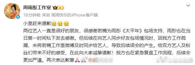 周雨彤工作室向章若楠以及粉丝道歉未及时感谢章若楠对太平年的云包场支持。