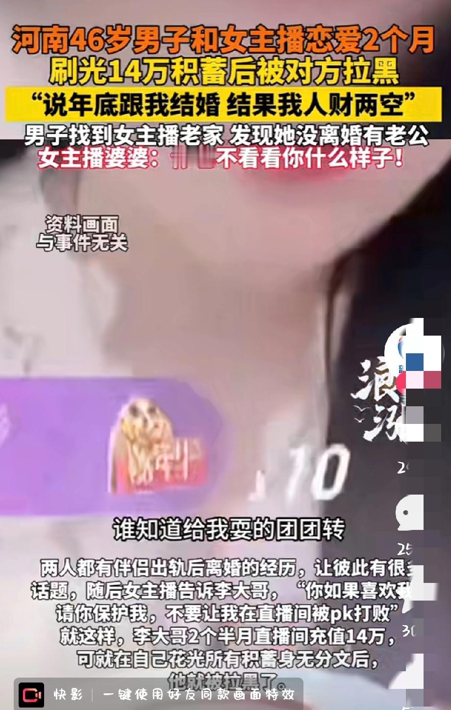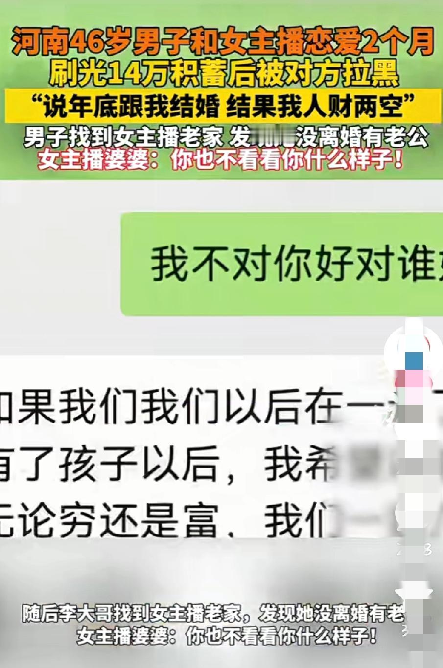 “说年底和我结婚,结果人财两空”46岁男子为女主播刷光14万积蓄,还被对方婆婆嘲讽“你也不看看你什么样”! 近日河南驻马店,46岁离异单身的李先生遭遇了一场荒唐的网络恋爱骗局,仅仅两个半月,他为网恋的女主播刷光14万积蓄,满心期待的年底结婚承诺成了空谈,被拉黑后寻至女方老家才发现,对方不仅并非单身,甚至从未离婚,而女主播婆婆的一句嘲讽,更让他心寒不已。 2025年4月,李先生在网上结识了这位自称30岁、同样离异单身的女主播,相似的感情经历让两人迅速拉近关系,女主播的一句“不在乎外表和钱财,脾气合得来就好”,让渴望陪伴的李先生动了心。确定恋爱关系后,女主播许下美好承诺,称见面合适便年底回家结婚,还以“保护我就要在直播间支持我”为由,让李先生为其刷礼物。 为了这份“奔现婚姻”,李先生开启了疯狂打赏模式,哪怕是日常的直播PK,他也尽全力为女主播撑场面,短短两个半月,便将自己的14万积蓄全部刷空,成了对方直播间的“榜一大哥”。可让他没想到的是,就在存款清零的那一刻,女主播的态度陡然转变,直接将他拉黑,此前的甜蜜与承诺消失得无影无踪。 不甘心的李先生多方打听后,辗转找到女主播的老家,却得知了一个残酷的真相:女主播根本没有离婚,所谓的单身离异全是谎言。面对找上门的李先生,女主播的婆婆不仅没有歉意,反而直言指责“你也不看看你什么样子”。 随后李先生联系上女主播的丈夫,对方称两人只是分居一年多现已和好,还声称女主播曾多次劝阻李先生打赏,是其执意为之。目前李先生已选择报警,双方均表示会保留证据,通过法律途径解决此事。 人到中年,想要有一个知冷知热的人陪伴在身边的想法无可厚非,可是李先生却忽略了网络的虚拟性。网络上的信息真真假假,难以分辨,女主播几句甜言蜜语就轻易让李先生放下了防备。 李先生的遭遇给我们敲响了警钟,在面对网络恋爱时,一定要保持清醒的头脑,不能被一时的情感冲昏了头。在投入感情和金钱之前,要多了解对方的真实情况,不能仅凭对方的一面之词就深信不疑。 同时,网络平台也应该加强监管,规范主播的行为,避免类似的骗局再次发生。对于那些利用虚假信息骗取他人钱财和感情的人,必须要严惩不贷。