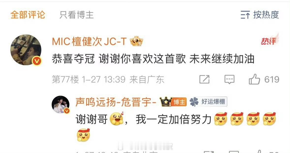 檀健次恭喜危晋宇夺冠声鸣远扬榜样认可,实力加冕,危晋宇冠军夜圆满!