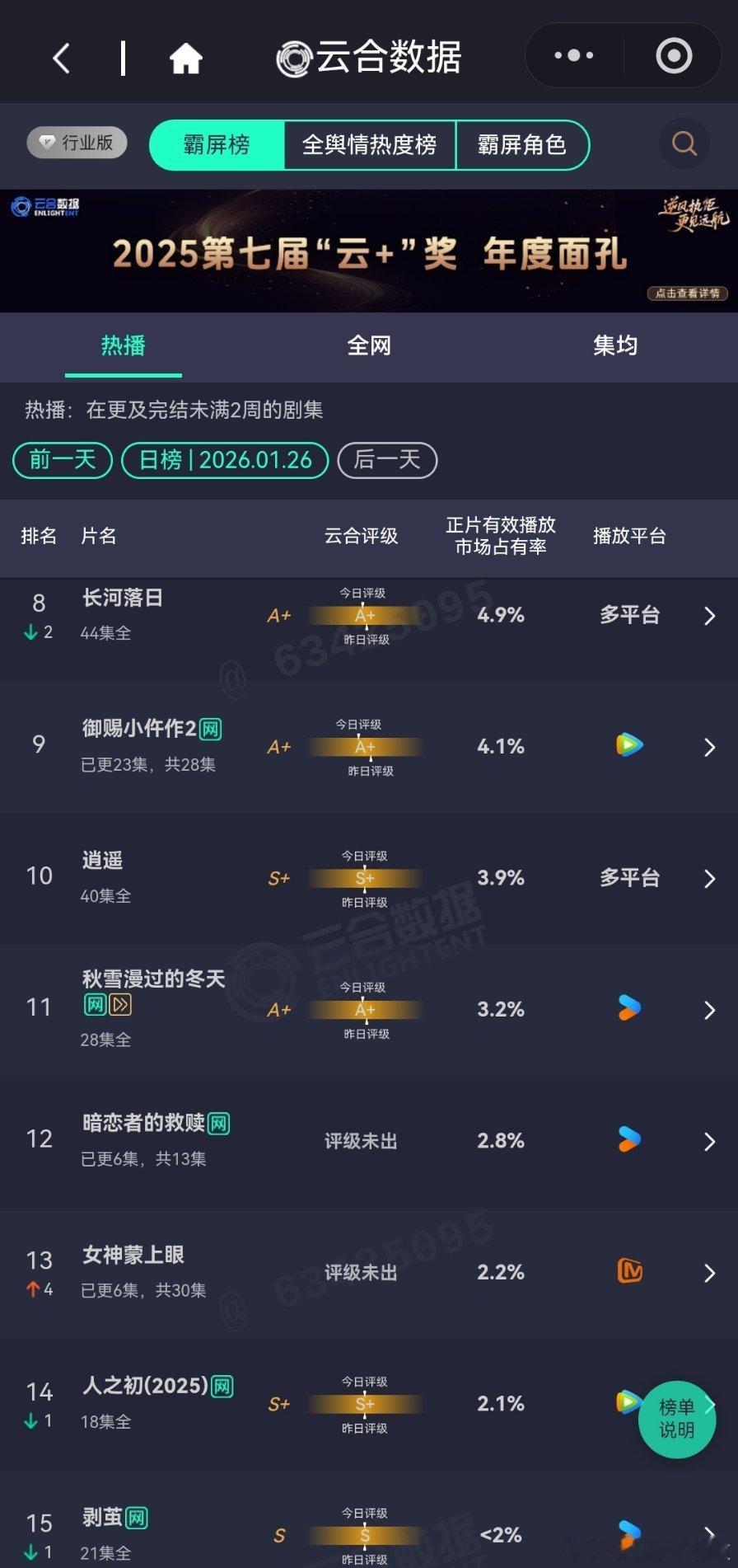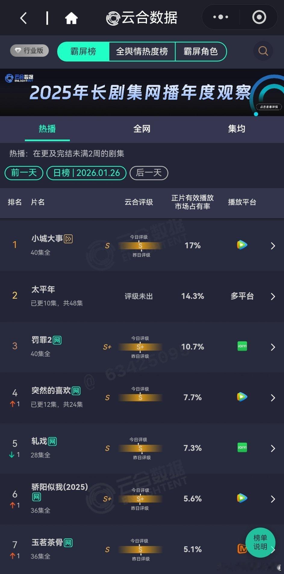 1月26日云合播放占比云合 小城大事17%看目前趋势应该还能再苟几天。太平年14.3%本来指望它最晚第三天登顶的,错付了。罚罪2 10.7%看来看去还是它最争气。突然的喜欢7.7%评级S