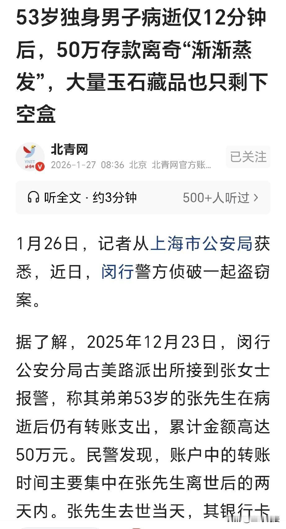 上海,一53岁男子是独身,请了个保姆照顾生活,保姆照顾他4年,买东西都是保姆拿男子的手机支付,谁知男子刚死,保姆拿着他的手机,转走男子50万元,还把男子收藏的玉器拿去变现,不料被男子姐姐发现,姐姐报警,保姆语出惊人: 我和他是没领证的夫妻,可警方一查,真相令人意想不到! 张女士弟弟去世,她悲痛欲绝,弟弟张先生命运悲苦,他的妻子早已经去世。 他无儿无女,独自一人居住,他有两套房子,还有不菲的积蓄,他的生活,安然无忧。 到了后来,他年纪大了,因为身体不好,就找了保姆刘某来照顾生活。 可刘某照顾他4年,张先生还是去世了,张先生没有妻子孩子,只有母亲的姐姐是他的亲人。 张女士悲痛欲绝,可是她突然发现,弟弟都已经去世了,他的账户中依旧有转账支付。 张女士就起了疑心,弟弟53岁,生前存有大量的积蓄,他生病时,并没把钱用完,怎么去世后还会有转账支出那? 2025年12月23日,张女士前去报警,她告述警方,张先生病逝后账户转出50万元。 警方立刻调查,发现这转账透着奇怪,主要是在张先生去世后的两天之内。 他去世当天,卡上的金额就转走20万元,明细上还显示,不但转走20万元,还从取款机上取了10000。 到了第二天,流水上显示,张先生的卡上又被转走了29万,这样一算,那可不是刚好50万元? 民警一看时间,张先生是当天9:33分去世,他尸骨未寒,刚过12分钟,卡上就被转走10万元。 交易上显示,这笔钱被转入了保姆刘某账户,警方立刻联系刘某,要她到派出所配合调查。 刘某来到之后,民警的威严让她害怕,她心里慌了,如实的交代,她说这么多年,张先生的手机支付都是由她来操作。 因此以来,她早就知道张先生的支付密码,她大言不惭,还说她和张先生是没领证的夫妻。 可是,她是一派胡言,她有自己的家庭,她还有两个孩子,她没有离婚,怎么可能和张先生是夫妻关系。 即便她和张先生是同居,他们没有领证,这个关系也得不到承认。 她只是张先生请来的保姆,来照顾张先生的日常起居而已。 经过调查,刘某是已婚人士,作为保姆照顾张先生4年。 可是她没有摆正自己的位置,在张先生去世后她就生出了贪念。 她要霸占张先生的财产,随后,她陆续转走张先生卡上的50万元,她还感觉不够。 刘某知道,张先生快收藏,他有两处住宅,平常会收藏一些玉器。 刘某知道这些玉器价值不菲,她立刻行动,将玉器拿走变成了现金。 刘某怕被发现,转账完后还删除了记录,可天网恢恢,她过于天真,以为这样,别人就发现不了她的罪行。 张先生孤身一人,去世前并没有留下遗嘱,因此他的遗产应该按照法定继承。 他的妻子早年过世,并没有留下一个孩子,张先生唯一的亲人就是母亲和姐姐,母亲才是他的遗产第一继承人。 张先生没有给刘某留遗嘱,更没有打算给她任何的财产,刘某说她和张先生是没证的夫妻,这个说法根本就不成立。 虽然在张先生生前,一直是由刘某用他的手机进行日常支付,但是这并不能证明她有权利支配张先生的财物。 刘某的行为,目的是要非法占有张先生的遗产,张先生的财物归母亲所有,刘某转款拿玉器的行为,就是窃取了别人的财物。 刘某以涉嫌盗窃,已被警方拘留,不该拿的,一分她也拿不走! 目前,此案件在进一步的调查审理。 《刑法》第264条规定,盗窃罪是指以非法占有为目的,盗窃公私财物数额较大,或者多次盗窃、入户盗窃、携带凶器盗窃、扒窃的行为。 刘某虽然在张先生生前掌握手机密码,但该授权仅限于代为操作日常开销,在张先生去世的一刻,该委托代理关系即刻终止。 刘某在张先生离世仅12分钟后即开始转账,并随后变卖玉器、删除记录。 这种趁家属不知情、秘密转移财产的行为完全符合盗窃罪。 由于张先生已过世,刘某不再是代为保管财物,刘某贪心,涉案金额达50万元及大量的玉石变现。 刘某盗窃金额特别巨大,面临的可能是十年以上有期徒刑或无期徒刑。 由于张先生妻子已故且无子女,其第一顺位继承人仅剩母亲。 姐姐张女士虽非第一顺位,但作为利害关系人有权代母亲处理或报警维权。 刘某既无遗嘱支持,也无遗赠扶养协议,其任何转账行为是对法定继承人财产所有权的侵 害。 刘某转账后删除记录,证明刘某完全清楚自己的行为并非“继承”或“受赠”,而是非法占有。 这种试图逃避法律追究的行为,在量刑时通常会被视为情节严重。 刘某将为自己的行为付出代价。 对此,你怎么看?