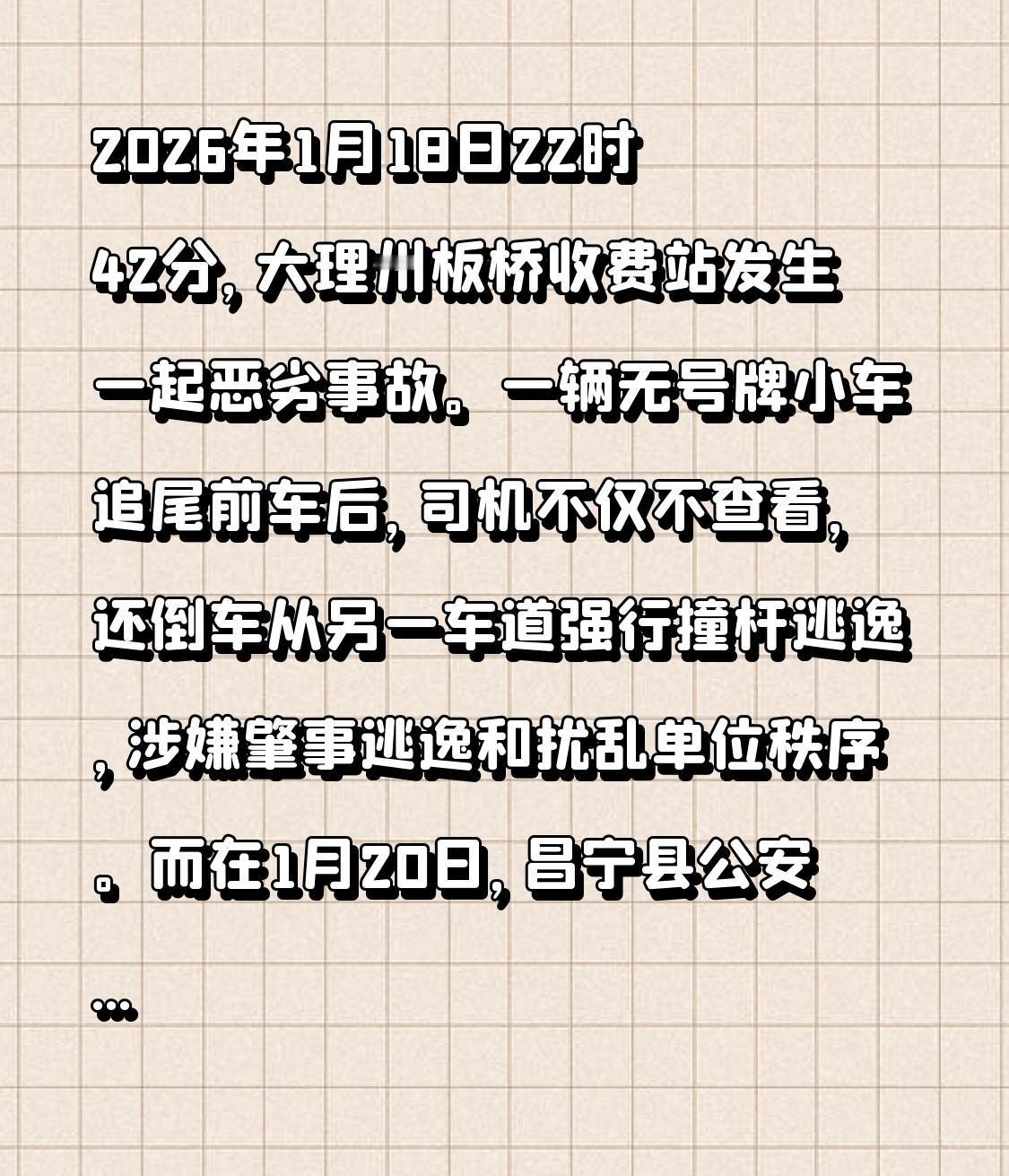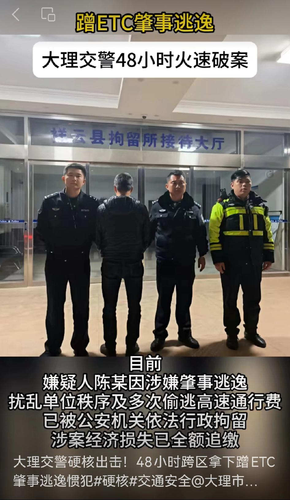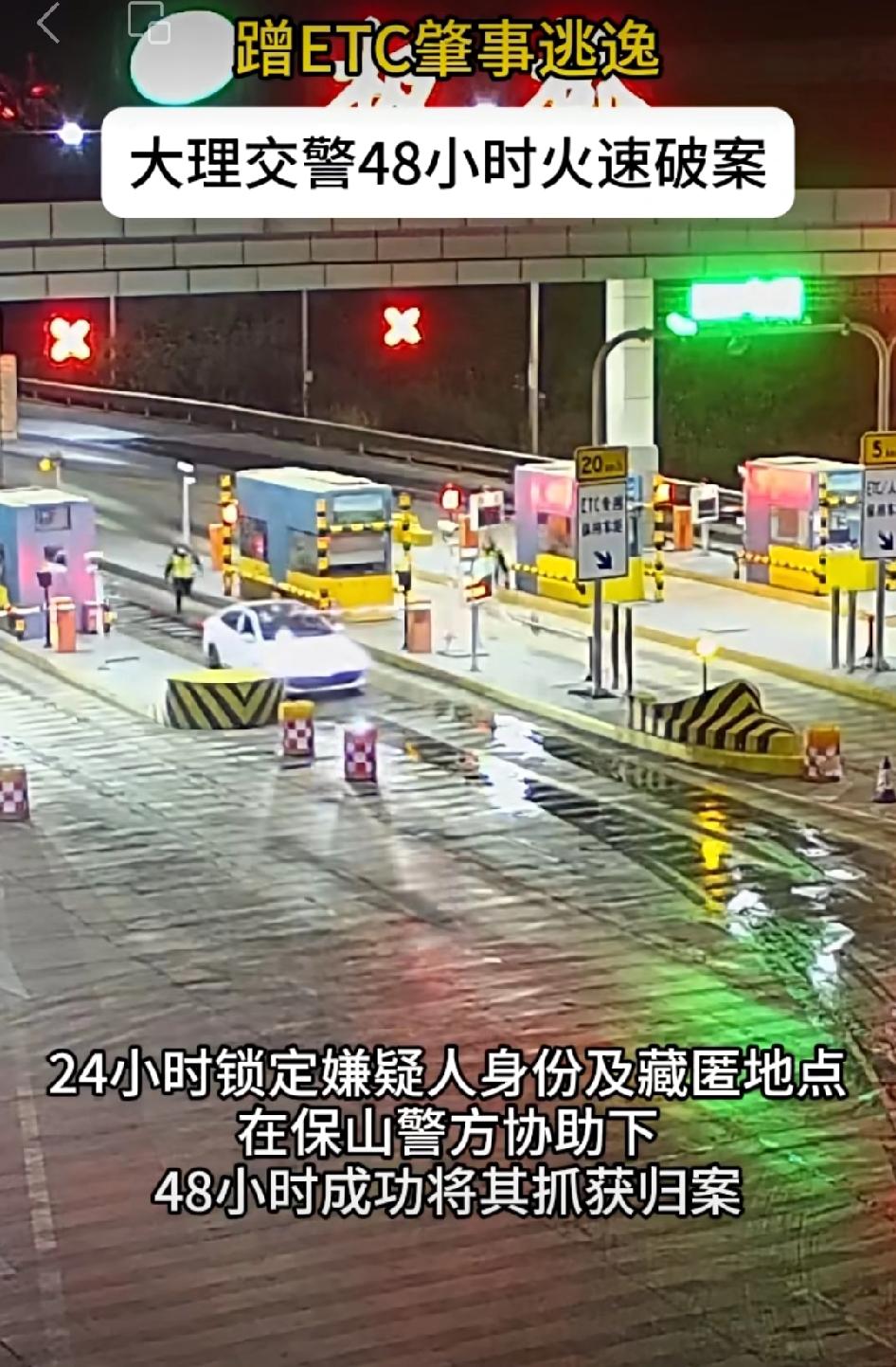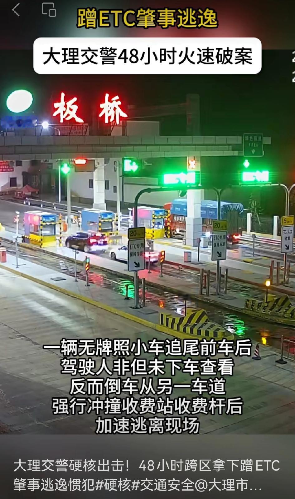 2026年1月18日22时42分,大理州板桥收费站发生一起恶劣事故。一辆无号牌小车追尾前车后,司机不仅不查看,还倒车从另一车道强行撞杆逃逸,涉嫌肇事逃逸和扰乱单位秩序。 而在1月20日,昌宁县公安局田园派出所协助大理州警方,抓获在逃嫌疑人孟某某。他通过“蹭”ETC逃费,还碰撞车辆、撞杆逃离。警方协作高效,迅速锁定其在田园镇的落脚点并将其抓获,孟某某也对违法事实供认不讳。大理交警48小时就破获此类案件,这速度太牛了,必须点赞,也给违法者敲响了警钟!