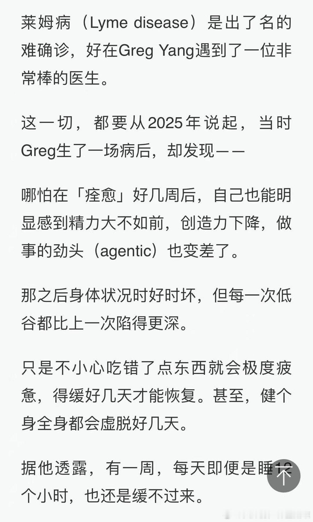 又一位因疾病缠身,而离开岗位的传奇人物。马斯克 xAI 联合创始人杨格,因早年疑似被蜱虫撕咬,患上了莱姆病,虽然后续他人比较正常,但在全力以赴创建 xAI、长期劳累、免疫系统下降后,症状才开始显现。结果产生了后遗症,日常精力下降、创造力变弱、行动力迟缓,最终不得不离开他心爱的 xAI。回归专职治疗和休息。