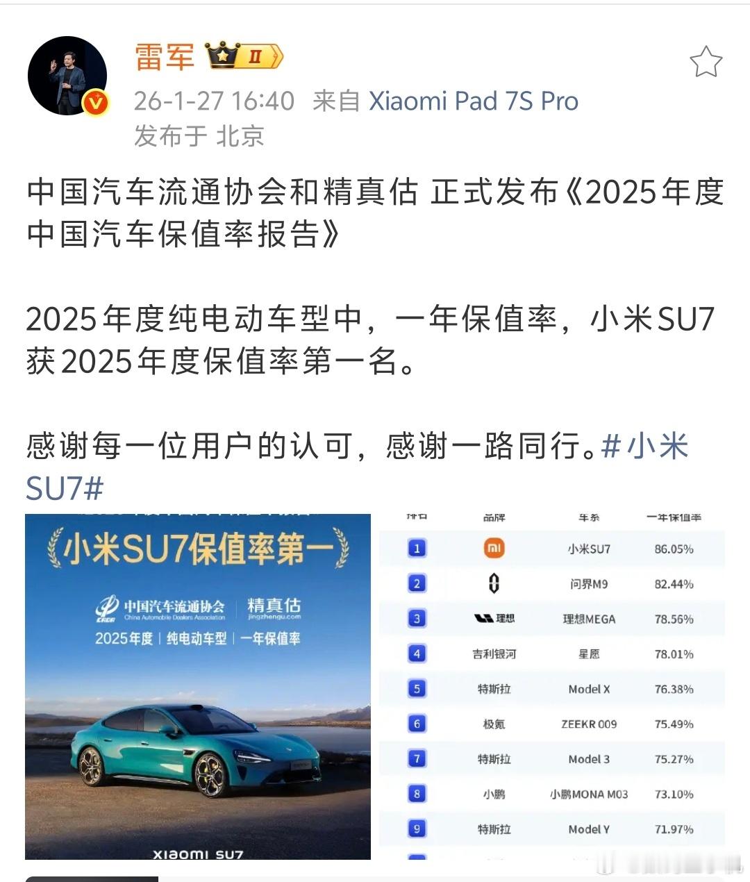 雷军回应小米SU7保值率第一名看到雷总的回应了,SU7在保值率方面堪称同级标杆,并且在销量、市场认可度等多方面表现卓越,25年纯电保值率达86%,首次上榜即成近三年最高,超越24年毛豆X的81%和23年Taycan的80%,含金量十足,要不咋说一年保值率80%以上都是市场高度认可的产品。易车销量显示这一代SU7超39万,市场流通性好,二手车周转期仅10天,远超均值,深受大众喜爱,百万网友严选出来的就是靠谱,安全、操控、智能化均无短板,妥妥儿的六边形战士。此外还扭转了电动车保值率不如油车的认知,首次上榜就有86%保值率,不断刷新中国纪录,老SU7已实现对特斯拉毛豆3的超越,如今新SU7完美换代,实力更强,将来无论是从销量还是保值率来看,都终结了毛豆3的中国神话,新SU7无疑更值得期待哈。