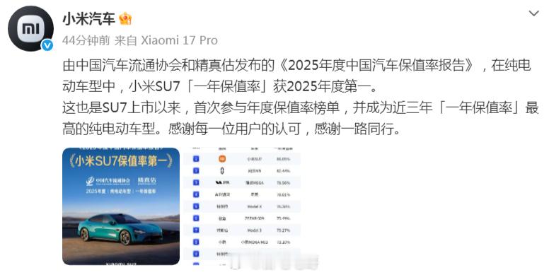 《2025年度中国汽车保值率报告》发布了在纯电动车型中,小米SU7「一年保值率」