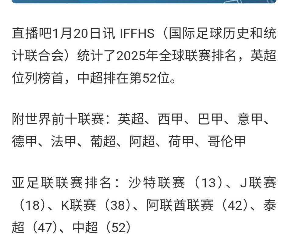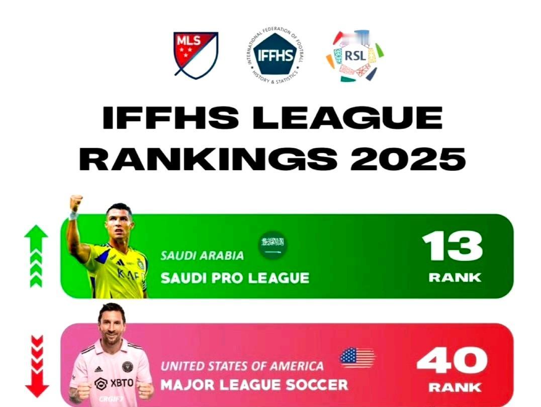 IFFHS2025年全球联赛排名:英超西甲前二,沙特联第13,美职联仅第40。中超第52、亚足联第6。 C罗以一人之力将沙特联带到它不该有的高度,梅球王所在的美职联跟中超相差不大。 两人的含金量可想而知……