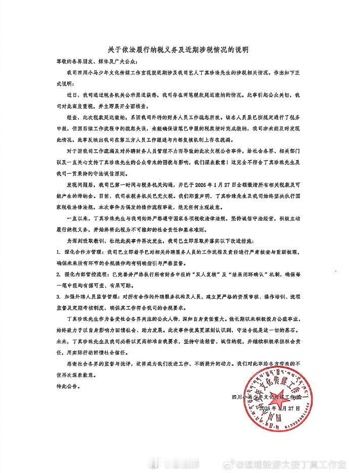 【丁真工作室称目前已无欠税】1月27日,丁真名下工作室欠税3.4万被公告引发关注,发布关于依法履行纳税义务及近期涉税情况的说明。 经查,此次税款延迟缴纳,系因我司外聘的财务人员工作疏忽所敢。该名人员虽已按规定进行了税务中报,但因后续工作流程中的蔬忽失误,未能确保该笔已申报的税款按时完成缴纳,我司亦未能及时发现此情况。此事反映出我司在第三方人员工作跟进与内部复核机制上存在疏漏。发现问題后,我司已第一时间与税务机关沟通,并巳于2026年1月27日全额缴清所有相关税款及可能产生的滞纳金。目前,我司在税务机关已无欠税。我们郑重声明,丁真珍珠先生及我司始终坚决执行国家税收法律法规,本次事件为偶发的操作流程事故,绝无任何主观故意。