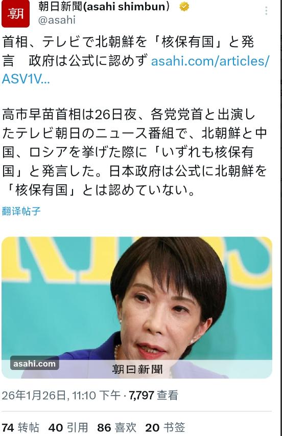1 月 26 日晚上,高市早苗和其他各党的党首在出席朝日电视台的节目时,再次犯下了一个重大的外交失言。那就是把朝鲜称为是一个 “拥核国”。这某种程度上再次体现出了高市本人外交常识和训练的缺乏,即在处理重大外交议题时缺乏精准的把握,以及谨慎的精神。 说真的,这哪里是什么简单的口误,纯纯是外交常识的硬伤,但凡懂点国际规则的人都知道,这是碰都不能碰的基本认知错误,而高市早苗作为日本政坛的核心人物,能在全国直播的节目里说出这话,属实是把日本的外交脸面丢到了全世界,说出去都能让各国外交官笑掉大牙。 但凡了解国际政治的都清楚,联合国安理会从始至终都没承认过朝鲜是拥核国,反而还通过多项决议,明确要求朝鲜放弃核导计划,实现半岛无核化,这是国际社会的基本共识,就跟小学生要背会乘法口诀、普通人要认路一样,是外交领域最基础的知识点。高市早苗倒好,身居高位,连这种入门级的常识都能搞错,很难让人相信她是真的不懂,还是为了政治算计故意装糊涂。 而且熟悉高市早苗的人都知道,这可不是她第一次犯这种低级错误了,这位铁杆右翼政客,仿佛天生就跟 “外交常识” 八字不合,之前在台湾问题上的一系列操作,早就刷新了大家对她无底线的认知。 一次次突破底线,一次次发表错误言论,足以看出高市早苗的脑子里,根本没有什么国际外交规则,只有右翼的政治算计。这次把朝鲜称作 “拥核国”,说白了还是老套路,就是想刻意炒作 “朝鲜威胁论”,迎合日本国内的右翼势力。 毕竟她一直以来的核心诉求,就是推动日本修宪扩军,废除和平宪法,把自卫队变成正规军,而想要实现这个目的,就必须在周边制造 “威胁”,让日本民众产生危机感,从而支持她的右翼主张。 只是这次她玩脱了,为了炒作威胁,连最基本的国际定性都不顾了。要知道,朝日关系本就因为历史问题、核问题搞得剑拔弩张,常年处于冰点,双方本就没什么实质性的对话和交流,高市早苗这一句话,直接是火上浇油,朝鲜本身对日本的态度就极其强硬,面对这种公然的错误定性,必然会进行强烈谴责,甚至会彻底暂停和日本的任何零星接触,让本就毫无进展的朝日关系,彻底陷入死局。 这波操作不光得罪了朝鲜,还直接打乱了美日韩在对朝问题上的协调节奏。美国和韩国在朝鲜核问题上,还有自己的一套策略和考量,哪怕是炒作朝鲜问题,也会遵循基本的国际定性,而高市早苗的一句失言,让美日韩的对朝步调再次出现分歧,韩国作为朝鲜的邻国,最看重半岛局势的稳定,日本政客这番乱放炮,只会让半岛局势变得更加紧张,韩国心里恐怕也早已满是不满。 更可笑的是,日本一直标榜自己是 “国际规则的维护者”,天天在国际上喊着要遵守秩序,结果自己的高层政客,却连最基本的国际共识都不遵守,一次次在重大外交议题上出洋相。 这也暴露了当下日本政坛的真实面目,被右翼势力牢牢绑架,很多政客为了捞取选票、巩固地位,只顾着迎合国内的右翼情绪,根本不管国家的外交形象和实际利益,把外交当成了国内政治秀的工具。 不出意外的话,接下来日本政府又会开启经典的 “擦屁股” 模式,官房长官大概率会出来含糊其辞地澄清,说这只是高市早苗的个人观点,不代表日本政府的官方立场,用这种模棱两可的说法,试图蒙混过关。 毕竟这在日本政坛早已是家常便饭,政客闯祸,政府背锅,最后不了了之,而高市早苗本人,大概率也不会正式道歉,只会硬着头皮嘴硬,这就是日本右翼政客的一贯作风。 说到底,高市早苗的这次外交失言,从来都不是偶然,而是日本政治持续右倾化的必然结果。当一个国家的外交,被一群缺乏基本常识、满脑子都是政治算计的右翼政客主导,那么出洋相、犯错误就是迟早的事。 只是高市早苗们只顾着自己的政治利益,却忘了,一次次的外交失言,损害的是日本的国家形象,消耗的是日本在国际社会的信任,最终买单的,还是普通的日本民众。 毕竟在国际社会,靠嘴炮和政治算计走不远,尊重基本的国际规则和常识,才是外交的根本,这一点,高市早苗恐怕永远都想不明白。