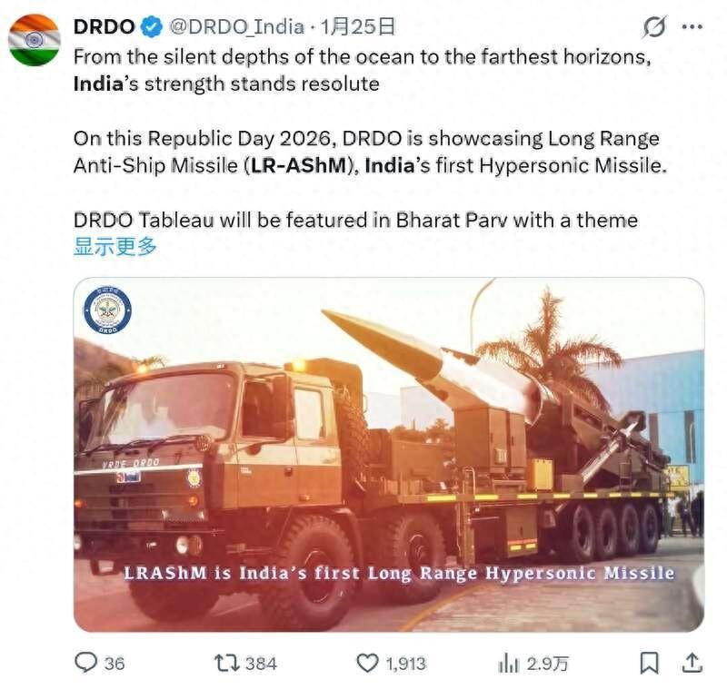 危险!印度也有高超音速导弹了?射出去能找着“北”吗? 印度1月26日“共和国日”大阅兵展示了一款代号为LR-AshM的高超音速导弹。 印度媒体欢呼“印度正式加入“高超音速武器俱乐部””。 咱就说常规导弹还找不着“北”呢,这就玩起高超音速导弹了? 那发出去不更不知道射哪去了! 之前印度导弹射出去找不着的案例就多的是, 就说2025年到现在就好几起。 2025年5月印度试射 “大地 - 1” 型战术导弹, 四枚导弹中三枚直接失控坠毁在自家旁遮普邦境内, 剩下一枚飞到巴基斯坦领空,被中国造的防空导弹精准拦截。 11月9日,印度空军的苏制S-125防空导弹发射失败, 因为制导失效,又射到拉贾斯坦邦村庄,造成3人受伤, 这一款装备因为长期没升级、维护缺失导致故障频发, 全年两次导弹事故直接反映了印度导弹装备技术老化和作战体系的系统性漏洞。 2026年1月12日作为主力运载火箭的 PSLV-C62 发射任务失败, 火箭第三级发动机燃烧异常引发姿态失控,搭载的16颗卫星全部损毁, 这次和2025年5月同型号火箭的故障是一个原因,都是推进系统的质量控制问题。 火箭和导弹的核心技术高度相通,火箭发射连续失败也就是说2025年发射失败的问题还没解决。 常规导弹问题没解决,高超音速能玩明白吗?跟他做邻居真挺危险。