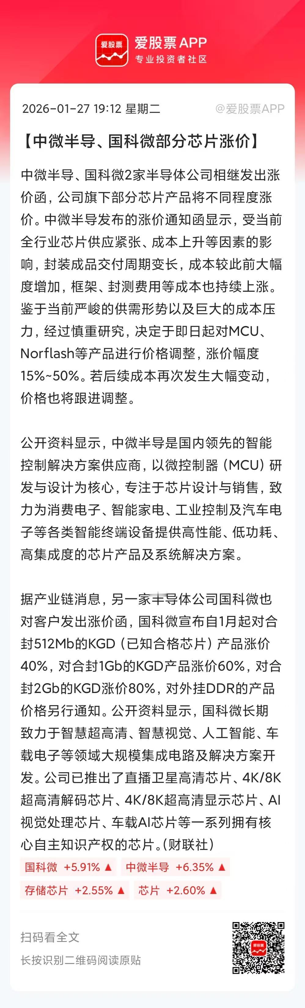 今晚中微半导、国科微相继发出涨价函,公司旗下部分芯片产品将不同程度涨价。 涨价幅度还挺大的,中微半导涨价幅度15%~50%,国科微涨价幅度高达40%~80%! 半导体板块中,核心主线毫无疑问是存储芯片,原因是涨价最猛。但现在涨价已经传导到封测、设备、材料等上下游环节,背后是上游晶圆厂涨价所导致的。 总之,这一轮AI扩张带来的产能紧缺,能会造成非常多的芯片产品涨价。这个影响是非常大的,对上游芯片+资源股是利好,但下游的消费电子和汽车行业压力非常大!比如电动车,光是铜、铝、锂等金属涨价+DRAM芯片暴涨,单车成本增加4000-7000元。利润可能就全被吞噬了。